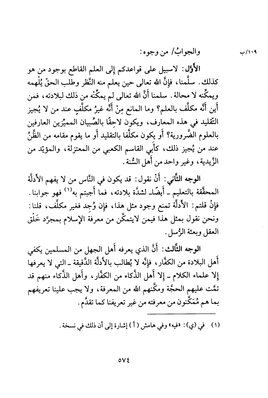 الأوّل: لا سبيل على قواعدكم إلى العلم القاطع بوجود من هو كذلك. سلّمنا, فإنّ الله تعالى حين يعلم منه النّظر وطلب الحقّ يلهمه ويمكّنه لا محالة. وسلمنا أنّ الله تعالى لم يمكّنه من ذلك لبلادته, فمن أين أنّه مكلّف بالعلم؟ وما المانع من أنّه غير مكلّف عند من لا يجيز التّقليد في هذه المعارف, ويكون لاحقاً بالصّبيان المميّزين العارفين بالعلوم الضّرورية؟ أو يكون مكلّفاً بالتقليد أو ما يقوم مقامه من الظّنّ عند من يجيز ذلك, كأبي القاسم الكعبي من المعتزلة, والمؤيّد من الزّيدية, وغير واحد من أهل السّنة.