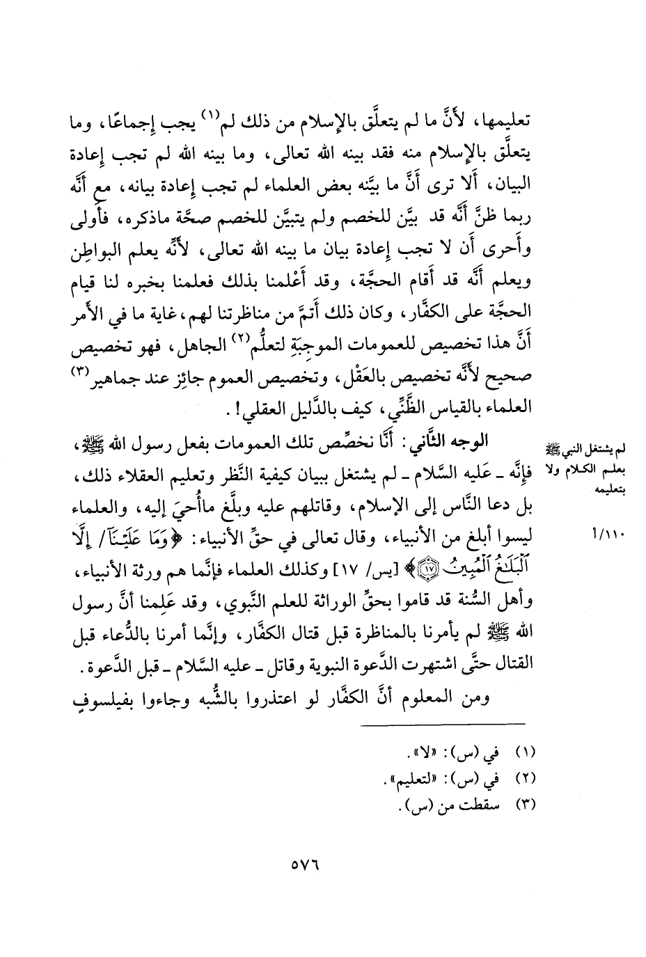 الوجه الثّاني: أنّا نخصّص تلك العمومات بفعل رسول الله - صلى الله عليه وسلم - , فإنّه - عليه السلام - لم يشتغل ببيان كيفية النّظر وتعليم العقلاء ذلك, بل دعا النّاس إلى الإسلام, وقاتلهم عليه وبلّغ ما أوحي إليه, والعلماء ليسوا أبلغ من الأنبياء, وقال تعالى في حقّ الأنبياء: ((وما علينا/إلا البلاغ المبين)) [يس/17] كذلك العلماء فإنّما هم ورثة الأنبياء, وأهل السّنة قد قاموا بحقّ الوراثة للعلم النّبوي, وقد علمنا أنّ رسول الله - صلى الله عليه وسلم - لم يأمرنا بالمناظرة قبل قتال الكفّار, وإنّما أمرنا بالدّعاء قبل القتال حتّى اشتهرت الدّعوة النبوية وقاتل - عليه السلام - قبل الدّعوة.