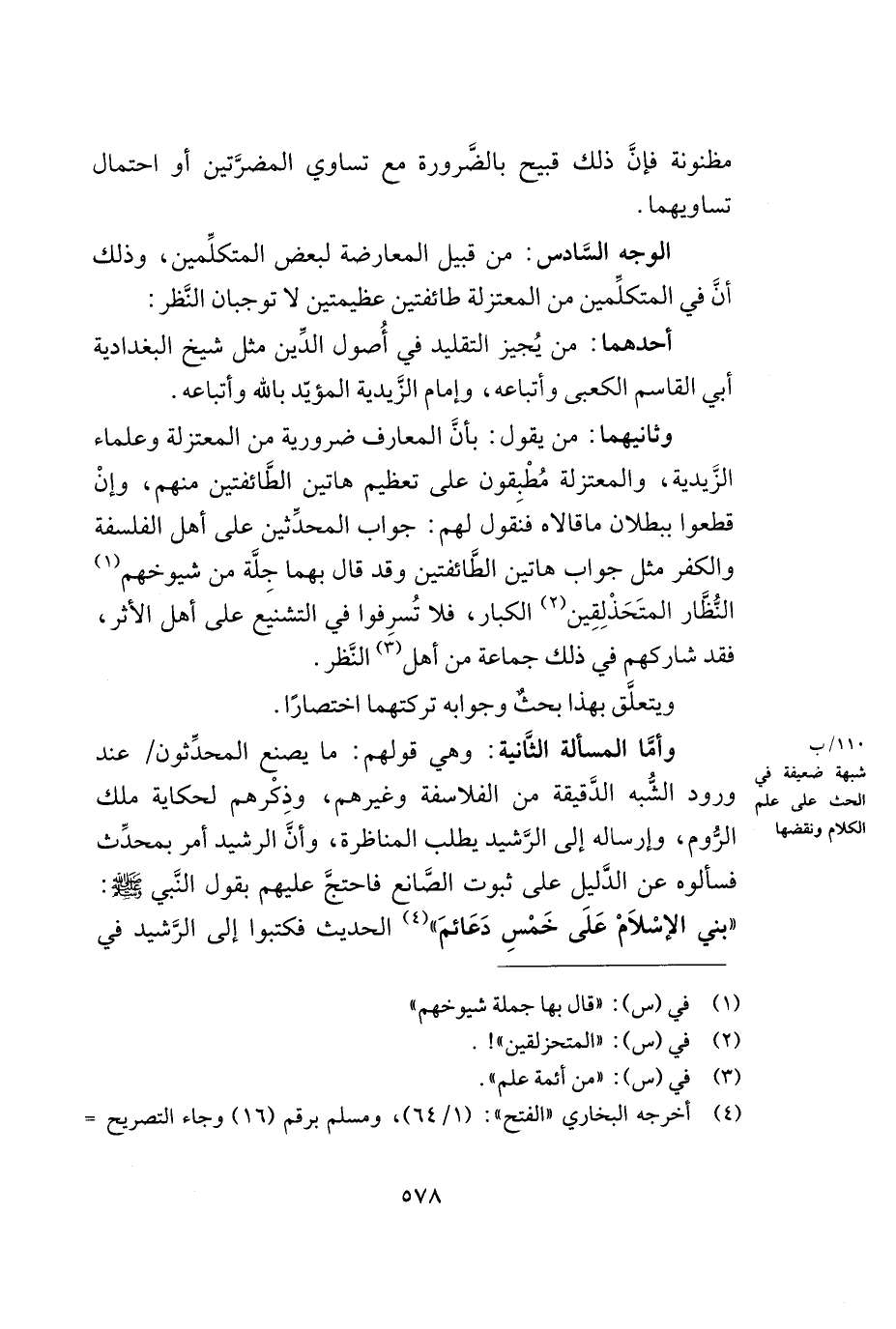 وأمّا المسألة الثّانية: وهي قولهم: ما يصنع المحدّثون/ عند ورود الشّبه الدّقيقة من الفلاسفة وغيرهم، وذكرهم لحكاية ملك الرّوم، وإرساله إلى الرّشيد يطلب المناظرة، وإنّ الرشيد أمر بمحدّث فسألوه عن الدّليل على ثبوت الصّانع فاحتجّ عليهم بقول النّبي - صلى الله عليه وسلم -: ((بني الإسلام على خمس دعائم)) (¬4) الحديث فكتبوا إلى الرّشيد في