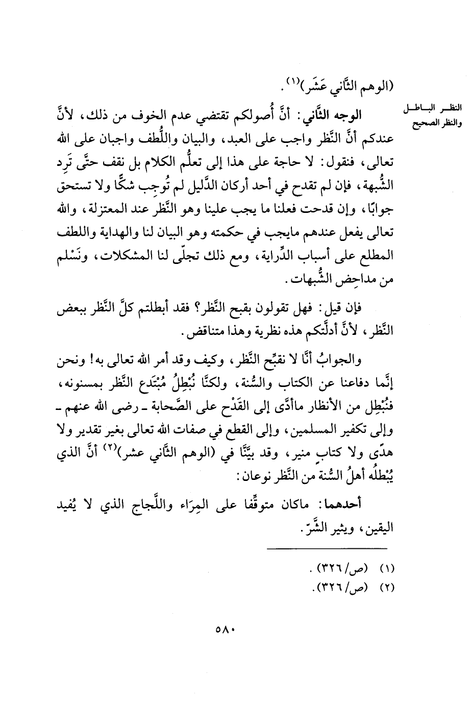 والجواب أنّا لا نقبّح النّظر، وكيف وقد أمر الله تعالى به! ونحن إنّما دفاعنا عن الكتاب والسّنة، ولكنّا نبطلُ مبتدع النّظر بمسنونه، فنبطل من الأنظار ما أدّى إلى القدح على الصّحابة - رضي الله عنه - وإلى تفكير المسلمين، وإلى القطع في صفات الله تعالى بغير تقدير ولا هدى ولا كتاب منير، وقد بيّنّا في (الوهم الثّاني عشر) (¬2) أنّ الذي يبطله أهل السّنة من النّظر نوعان: