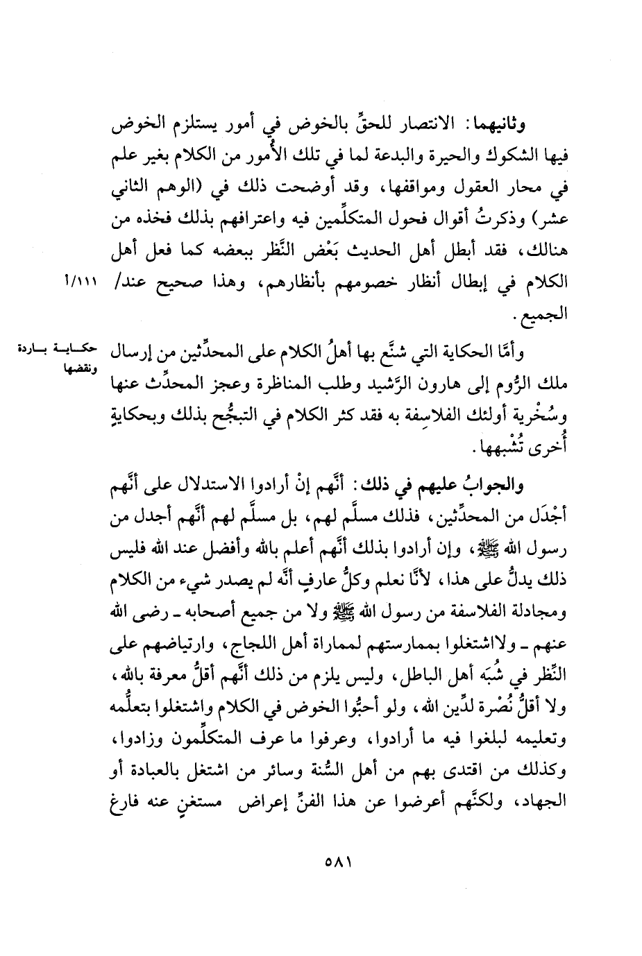 وأمّا الحكاية الني شنّع بها أهل الكلام على المحدّثين من إرسال ملك الرّوم إلى هارون الرّشيد وطلب المناظرة وعجز المحدّث عنها وسخرية أولئك الفلاسفة به فقد كثر الكلام في التبجّح بذلك وبحكاية أخرى تشبهها.