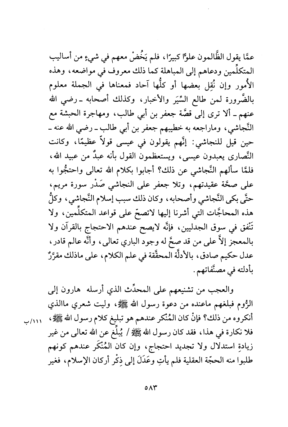 عمّا يقول الظّالمون علوّا كبيراً، فلم يخض معهم في شيء من أساليب المتكلّمين ودعاهم إلى المباهلة كما ذلك معروف في مواضعه، وهذه الأمور وإن نقل بعضها أو كلّها آحاد فمعناها في الجملة معلوم بالضّرورة لمن طالع السّير والأخبار، وكذلك أصحابه -رضي الله عنهم- ألا ترى إلى قصّة جعفر بن أبي طالب، ومهاجرة الحبشة مع النّجاشي، وما راجعه به خطيبهم جعفر بن أبي طالب - رضي الله عنه - حين قيل للنجاشي: إنّهم يقولون في عيسى قولاً عظيماً، وكانت النّصارى يعبدون عيسى، ويستعظمون القول بأنه عبدً من عبيد الله، فلمّا سألهم النّجاشي عن ذلك؟ أجابوا بكلام الله تعالى واحتجّوا به على صحّة عقيدتهم، وتلا جعفر على النجاشي صدر سورة مريم، حتّى بكى النّجاشي وأصحابه، وكان ذلك سبب إسلام النّجاشي، وكلّ هذه المحاجّات التي أشرنا إليها لا تصحّ على قواعد المتكلّمين، ولا تنفق في سوق الجدليين، فإنّه لا يصح عندهم الاحتجاج بالقرآن ولا بالمعجز إلاّ على من قد صحّ له وجود الباري تعالى، وأنّه عالم قادر، عدل حكيم صادق، بالأدلّة المحقّقة في علم الكلام، على ماذلك مقرّرً بأدلته في مصنّفاتهم.