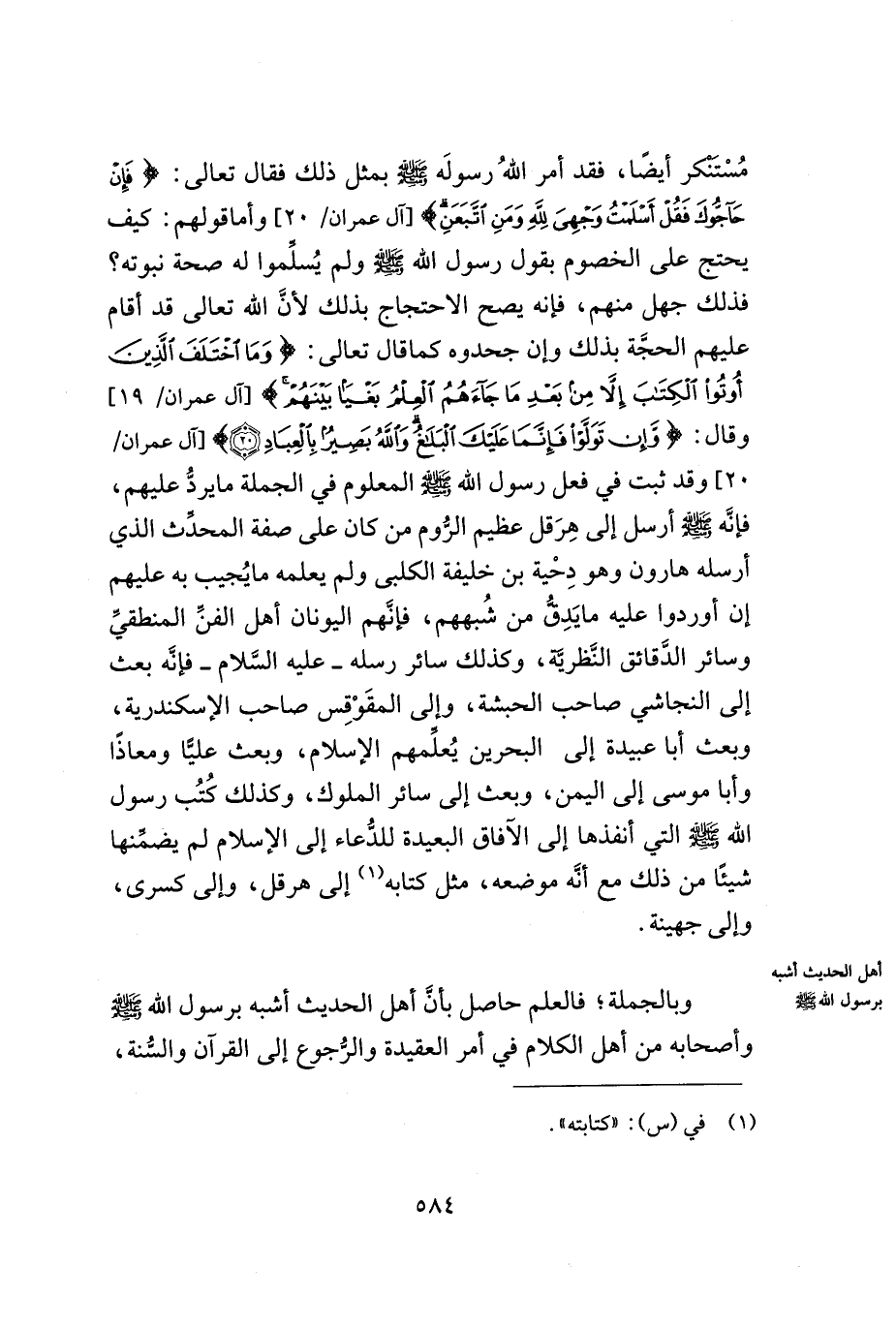 وبالجملة؛ فالعلم حاصل بأنّ أهل الحديث أشبه برسول الله - صلى الله عليه وسلم - وأصحابه من أهل الكلام في أمر العقيدة والرّجوع إلى القرآن والسّنّة,