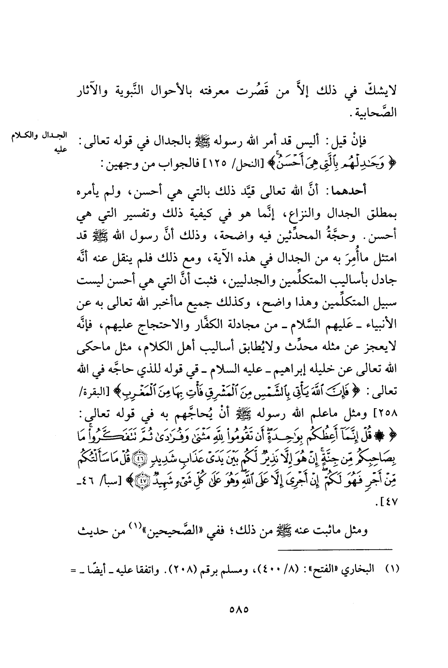أحدهما: أنّ الله تعالى قيّد ذلك بالتي هي أحسن, ولم يأمره بمطلق الجدال والنزاع, إنّما هو في كيفية ذلك وتفسير التي هي أحسن. وحجّة المحدّثين فيه واضحة, وذلك أنّ رسول الله - صلى الله عليه وسلم - قد امتثل ما أمر به من الجدال في هذه الآية, ومع ذلك فلم ينقل عنه أنّه جادل بأساليب المتكلّمين وهذا واضح, وكذلك جميع ما أخبر الله تعالى به عن الأنبياء ... -عليهم السّلام- من مجادلة الكفّار والاحتجاج عليهم, فإنّه لا يعجز عن مثله محدّث ولا يطابق أساليب أهل الكلام, مثل ما حكى الله تعالى عن خليله إبراهيم - عليه السلام - في قوله للذي حاجّه في الله تعالى: ((فإنّ الله يأتي بالشّمس من المشرق فأت بها من المغرب)) [البقرة/258] ومثل ما علم الله رسوله - صلى الله عليه وسلم - أن يحاجّهم به في قوله تعالى: ((قل إنّما أعظكم بواحدة أن تقوموا لله مثنى وفرادى ثم تتفكّروا ما بصاحبكم من جنّة إن هو إلا نذير لكم بين يدي عذاب شديد, قل ما سألتكم من أجر فهو لكم إن أجري إلا على الله وهو على كلّ شيء شهيد)) [سبأ/46 - 47].