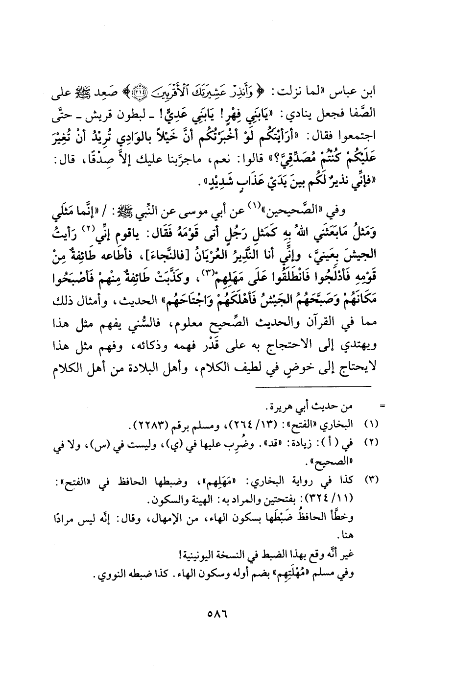 وفي ((الصّحيحين)) (¬1) عن أبي موسى عن النّبي - صلى الله عليه وسلم -:/ ((إنّما مثلي ومثل ما بعثني الله به كمثل رجل أتى قومه فقال: يا قوم إنّي (¬2) رأيت الجيش بعينيّ, وإنّي أنا النّذير العُريان [فالنّجاء] , فأطاعه طائفة من قومه فأدلجوا فانطلقوا على مهلهم (¬3) , وكذّبت طائفة منهم فأصبحوا مكانهم وصبّحهم الجيش فأهلكهم واجتاحهم)) الحديث, وأمثال ذلك مما في القرآن والحديث الصّحيح معلوم, فالسّني يفهم مثل هذا ويهتدي إلى الاحتجاج به على قدر فهمه وذكائه, وفهم مثل هذا لا يحتاج إلى خوض في لطيف الكلام, وأهل البلادة من أهل الكلام
