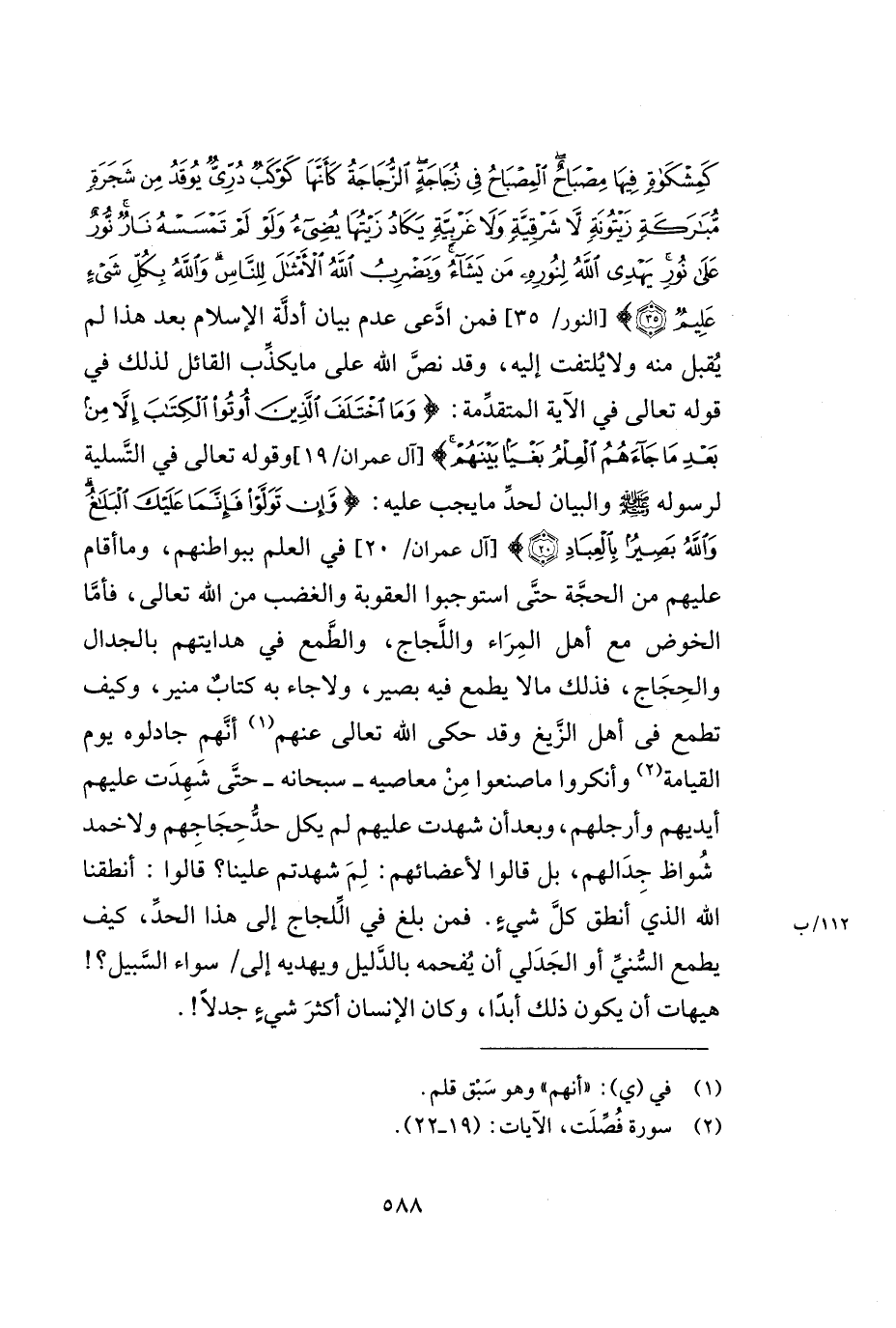 كمشكاة فيها مصباح المصباح في زجاجة الزّجاجة كأنها كوكب درّيّ يوقد من شجرة مباركة زيتونة لا شرقية ولا غربية يكاد زيتها يضيء ولو لم تمسسه نار نور على نور يهدي الله لنوره من يشاء ويضرب الله الأمثال للناس والله بكل شيء عليم)) [النور/35] فمن ادّعى عدم بيان أدلّة الإسلام بعد هذا لم يقبل منه ولا يلتفت إليه, وقد نصّ الله على ما يكذّب القائل لذلك في قوله تعالى في الآية المتقدّمة: ((وما اختلف الذين أوتوا الكتاب إلا من بعد ما جاءهم العلم بغياً بينهم)) [آل عمران/19] في العلم ببواطنهم, وما أقام عليهم من الحجّة حتّى استوجبوا العقوبة والغضب من الله تعالى, فأمّا الخوض مع أهل المراء واللّجاج, والطّمع في هدايتهم بالجدال والحجاج, فذلك ما لا يطمع فيه بصير, ولا جاء به كتاب منير, وكيف تطمع في أهل الزّيغ وقد حكى الله تعالى عنهم (¬1) أنّهم جادلوه يوم القيامة (¬2) وأنكروا ما صنعوا من معاصيه -سبحانه- حتّى شهدت عليهم أيديهم وأرجلهم, وبعد أن شهدت عليهم لم يكل حدّ حجاجهم ولا خمد شواظ جدالهم, بل قالوا لأعضائهم: لم شهدتم علينا؟ قالوا: أنطقنا الله الذي أنطق كلّ شيء. فمن بلغ في اللّجاج إلى هذا الحدّ, كيف يطمع السّنّي أو الجدلي أن يفحمه بالدّليل ويهديه إلى/ سواء السّبيل؟! هيهات أن يكون ذلك أبداً, وكان الإنسان أكثر شيء جدلاً!.