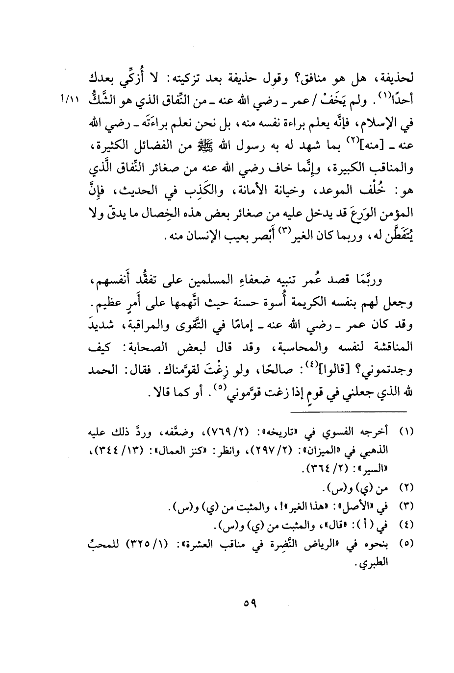 وربّما قصد عمر تنبيه ضعفاء المسلمين على تفقّد أنفسهم, وجعل لهم بنفسه الكريمة أسوة حسنة حيث أتّهمها على أمر عظيم. وقد كان عمر - رضي الله عنه - إماماً في التّقوى والمراقبة, شديد المناقشة لنفسه والمحاسبة, وقد قال لبعض الصحابة: كيف وجدتموني؟ [قالوا] (¬4):صالحاً, ولو زغت لقوّمناك. فقال: الحمد لله الذي جعلني في قوم إذا زغت قوّموني (¬5) أو كما قالا.