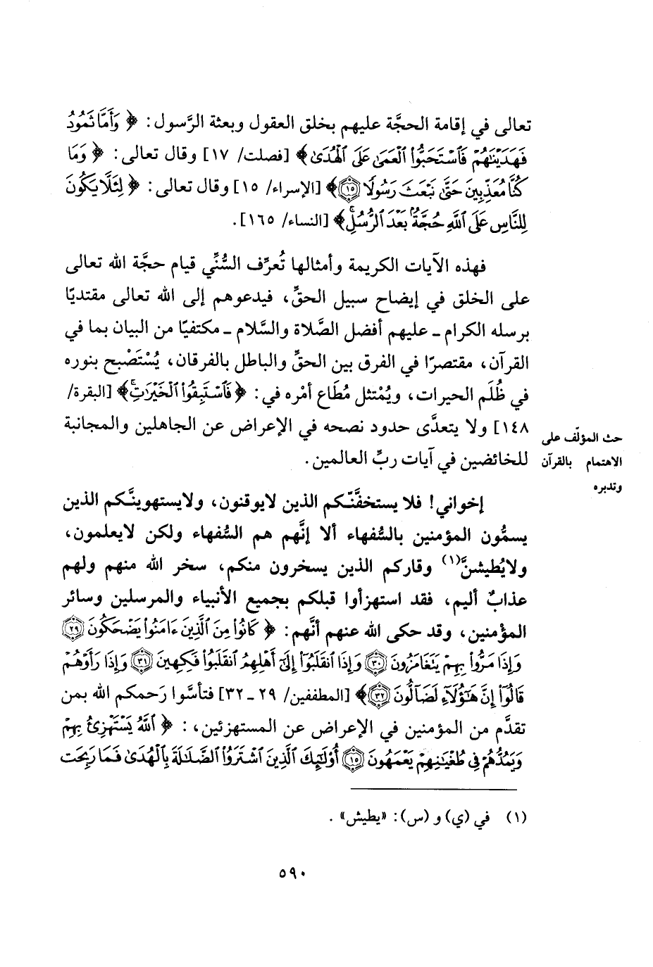 فهذه الآيات الكريمة وأمثالها تعرّف السّنّي قيام حجّة الله تعالى على الخلق في إيضاح سبيل الحقّ, فيدعوهم إلى الله تعالى مقتدياً برسله الكرام -عليهم أفضل الصّلاة والسّلام- مكتفياً من البيان بما في القرآن, مقتصراً في الفرق بين الحقّ والباطل بالفرقان, يستصبح بنوره في ظلم الحيرات, ويمتثل مطاع أمره في: ((فاستبقوا الخيرات)) [البقرة/148] ولا يتعدّى حدود نصحه في الإعراض عن الجاهلين والمجانبة للخائضين في آيات ربّ العالمين.