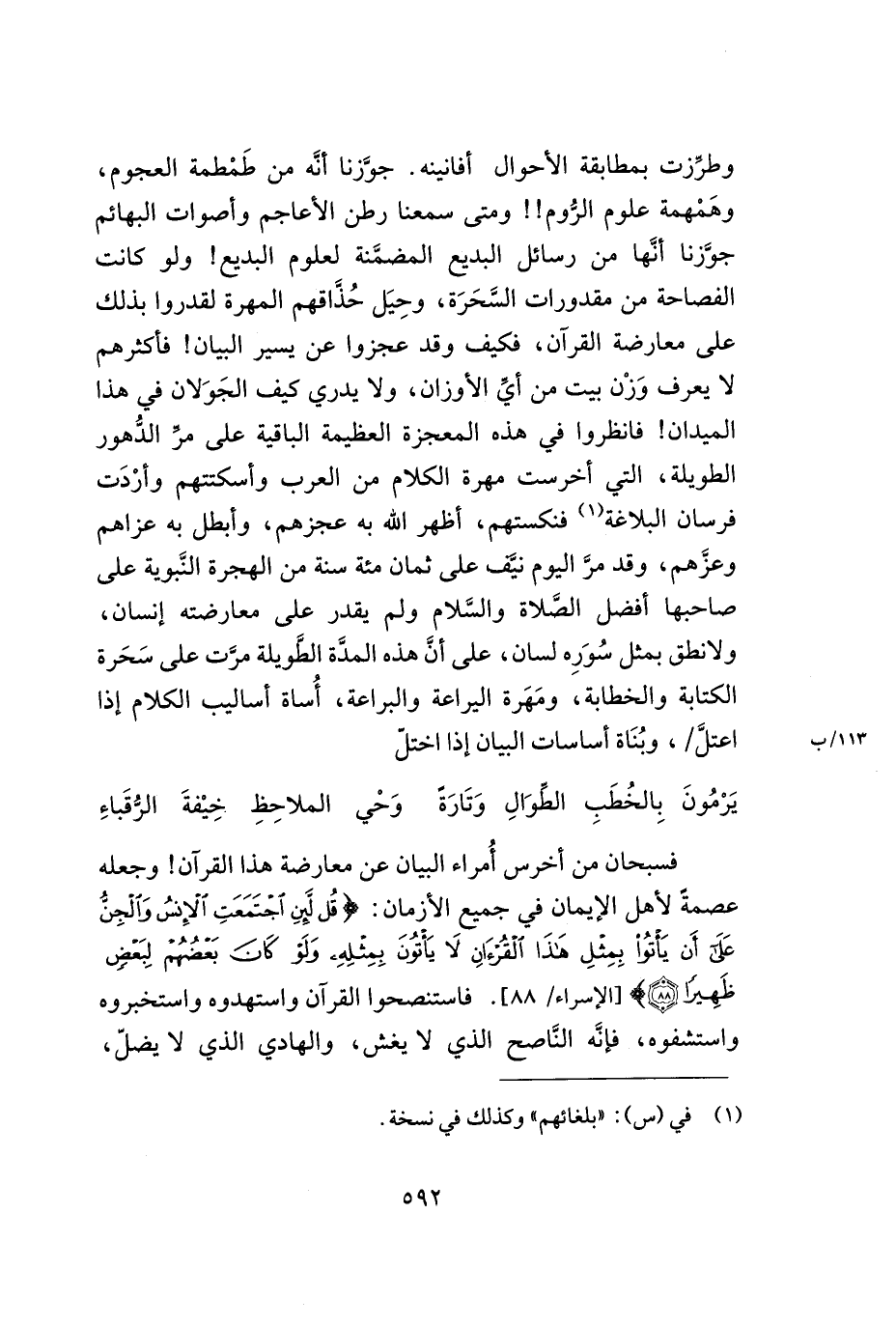 وطرّزت بمطابقة الأحوال أفانينه. جوّزنا أنّه من طمطمة العجوم, وهمهمة علوم الرّوم!! ومتى سمعنا رطن الأعاجم وأصوات البهائم جوّزنا أنّها من رسائل البديع المضمّنة لعلوم البديع! ولو كانت الفصاحة من مقدورات السّحرة, وحيل حذّاقهم المهرة لقدروا بذلك على معارضة القرآن, فكيف وقد عجزوا عن يسير البيان! فأكثرهم لا يعرف وزن بيت من أيّ الأوزان, ولا يدري كيف الجولان في هذا الميدان! فانظروا في هذه المعجزة العظيمة الباقية على مرّ الدّهور الطويلة, التي أخرست مهرة الكلام من العرب وأسكنتهم وأردت فرسان البلاغة (¬1) فنكستهم, أظهر الله به عجزهم, وأبطل به عزاهم وعزّهم, وقد مرّ اليوم نيّف على ثمان مئة سنة من الهجرة النّبوية على صاحبها أفضل الصّلاة والسّلام ولم يقدر على معارضته إنسان, ولا نطق بمثل سوره لسان, على أنّ هذه المدّة الطّويلة مرّت على سحرة الكتابة والخطابة, ومهرة اليراعة والبراعة, أساة أساليب الكلام إذا اعتلّ/, وبناة أساسات البيان إذا اختل.