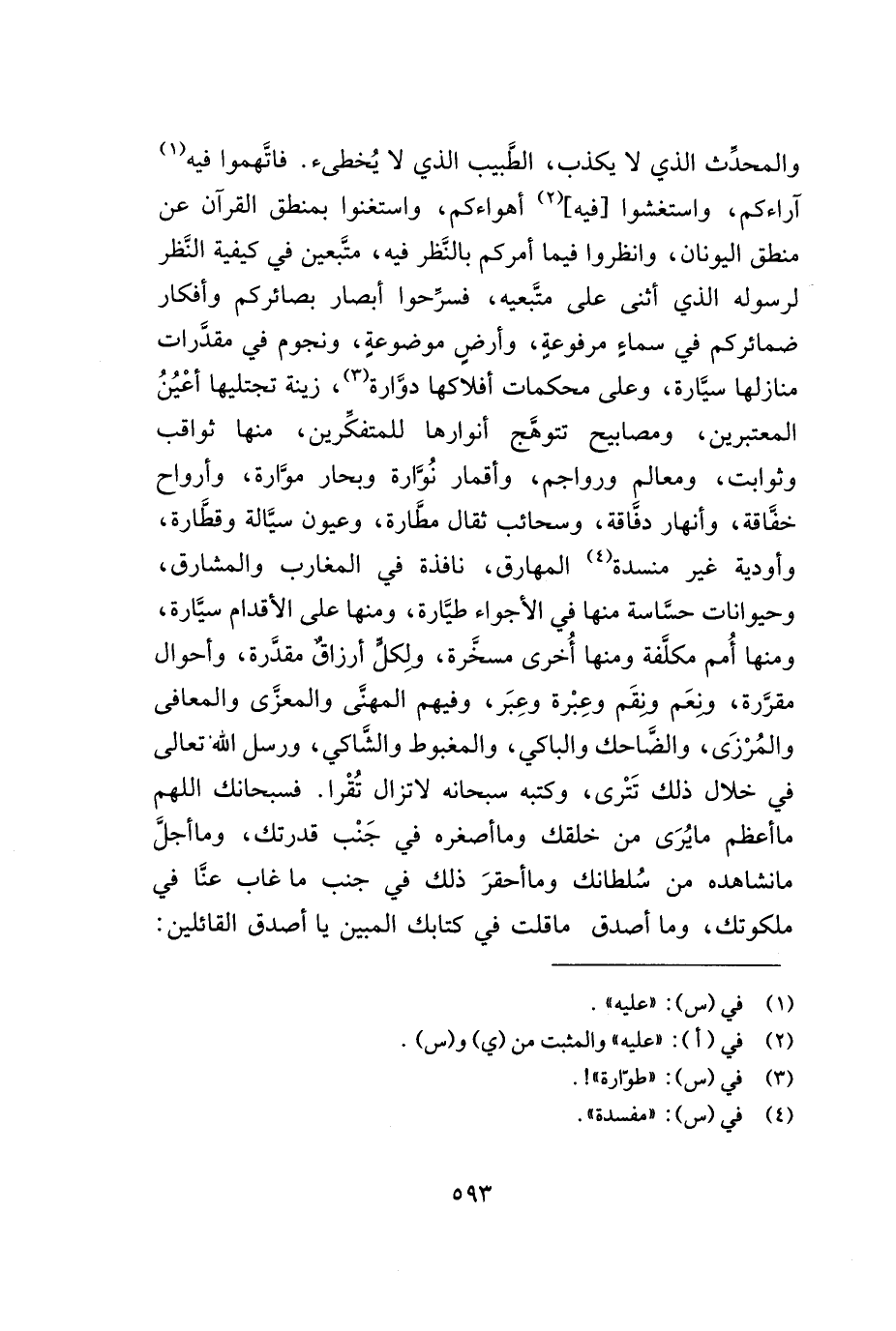 والمحدّث الذي لا يكذب, الطّبيب الذي لا يخطىء. فاتّهموا فيه (¬1) آراءكم, واستغشوا [فيه] (¬2) أهواءكم, واستغنوا بمنطق القرآن عن منطق اليونان, وانظروا فيما أمركم بالنّظر فيه, متّبعين في كيفية النّظر لرسوله الذي أثنى على متّبعيه, فسرّحوا أبصار بصائركم وأفكار ضمائركم في سماء مرفوعة, وأرض موضوعة, ونجوم في مقدّرات منازلها سيّارة, وعلى محكمات أفلاكها دوّارة (¬3) , زينة تجتليها أعين المعتبرين, ومصابيح تتوهّج أنوارها للمتفكّرين, منها ثواقب وثوابت, ومعالم ورواجم, وأقمار نوّارة وبحار موّارة, وأرواح خفّاقة, وأنهار دفّاقة, وسحائب ثقال مطّارة, وعيون سيّالة وقطّارة, وأودية غير منسدة (¬4) المهارق, نافذة في المغارب والمشارق, وحيوانات حسّاسة منها في الأجواء طيّارة, ومنها على الأقدام سيّارة, ومنها أمم مكلّفة ومنها أخرى مسخّرة, ولكلّ أرزاق مقدّرة, وأحوال مقرّرة, ونعم ونقم وعبرة وعبر, وفيهم المهنّى والمعزّى والمعافى والمرزى, والضّاحك والباكي, والمغبوط والشّاكي, ورسل الله تعالى في خلال ذلك تترى, وكتبه سبحانه لا تزال تقرأ. فسبحانك اللهم ما أعظم ما يرى من خلقك وما أصغره في جنب قدرتك, وما أجلّ ما نشاهده من سلطانك وما أحقر ذلك في جنب ما غاب عنّا في ملكوتك, وما أصدق ما قلت في كتابك المبين يا أصدق القائلين: