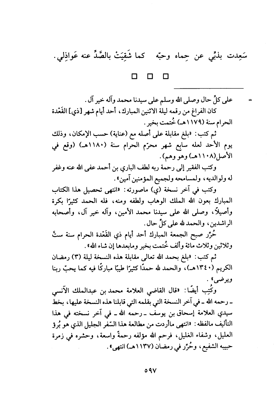 ثم كتب: ((بلغ مقابلة على أصله مع (عناية) حسب الإمكان, وذلك يوم الأحد لعله سابع شهر محرّم الحرام سنة (1180هـ) (وقع في الأصل (1108هـ) وهو وهم).