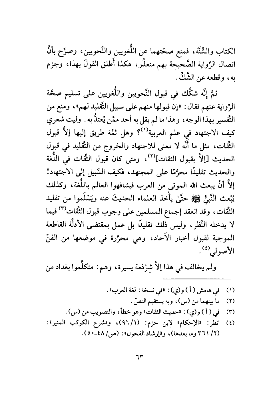 ثمّ إنّه شكّك في قبول النّحويين واللّغويين على على تسليم صحّة الرّواية عنهم فقال: ((إن قبولها منهم على سبيل التّقليد لهم)) , ومنع من التّفسير بهذا الوجه, وهذا ما لم يقل به أحد ممّن يعتدّ به. وليت شعري كيف الاجتهاد في علم العربية (¬1)؟ وهل ثمّة طريق إليها إلاّ قبول الثّقات, مثل ما أنّه لا معنى للاجتهاد والخروج من التّقليد في قبول الحديث [إلاّ بقبول الثقات] (¬2) , ومتى كان قبول الثّقات في اللّغة والحديث تقليداً محرّماً على المجتهد, فكيف السّبيل إلى الاجتهاد! إلاّ أن يبعث الله الموتى من العرب فيشافهوا العالم باللغّة, وكذلك يبعث النبي - صلى الله عليه وسلم - حتّى يأخذ العلماء الحديث عنه ويسلموا من تقليد الثّقات, وقد انعقد إجماع المسلمين على وجوب قبول الثّقات (¬3) فيما لا يدخله النّظر, وليس في ذلك تقليداً بل عمل بمقتضى الأدلّة القاطعة الموجبة لقبول أخبار الآحاد, وهي محرّرة في موضعها من الفنّ الأصوليّ (¬4).