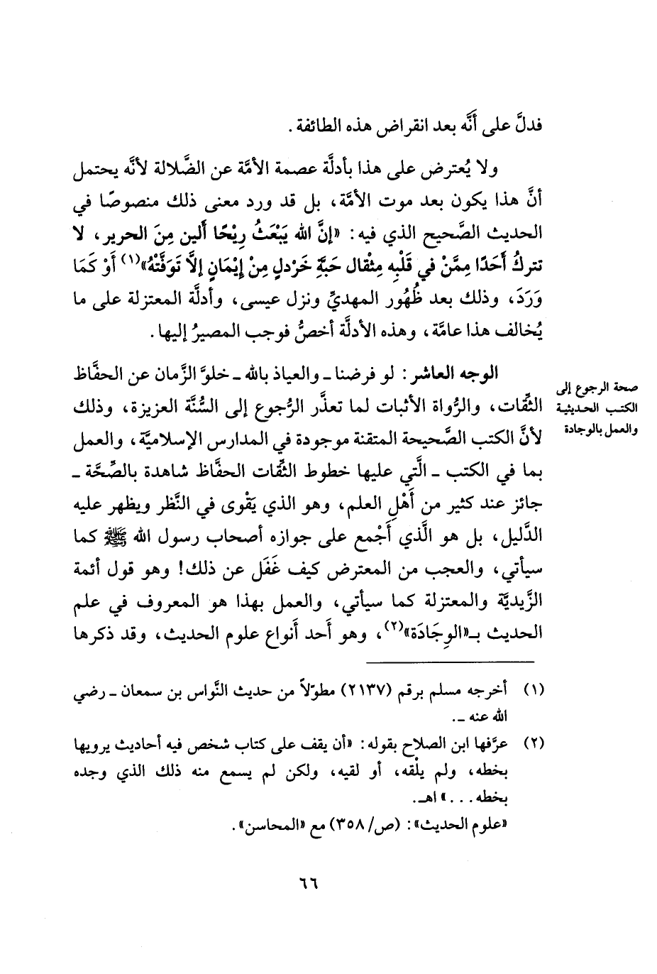 الوجه العاشر: لو فرضنا - والعياذ بالله- خلوّ الزّمان عن الحفّاظ الثّقات, والرّواة الأثبات لما تعذّر الرّجوع إلى السّنة العزيزة, وذلك لأنّ الكتب الصحيحة المتقنة موجودة في المدارس الإسلامية, والعمل بما في الكتب -التي عليها خطوط الثّقات الحفّاظ شاهدة بالصّحة- جائز عند كثير من أهل العلم, وهو الذي يقوى في النّظر ويظهر عليه الدّليل, بل هو الذي أجمع على جوازه أصحاب رسول الله - صلى الله عليه وسلم - كما سيأتي, والعجب من المعترض كيف غفل عن ذلك! وهو قول أئمة الزّيدية والمعتزلة كما سيأتي, والعمل بهذا هو المعروف في علم الحديث بـ ((الوجادة)) (¬2) , وهو أحد أنواع علوم الحديث, وقد ذكرها