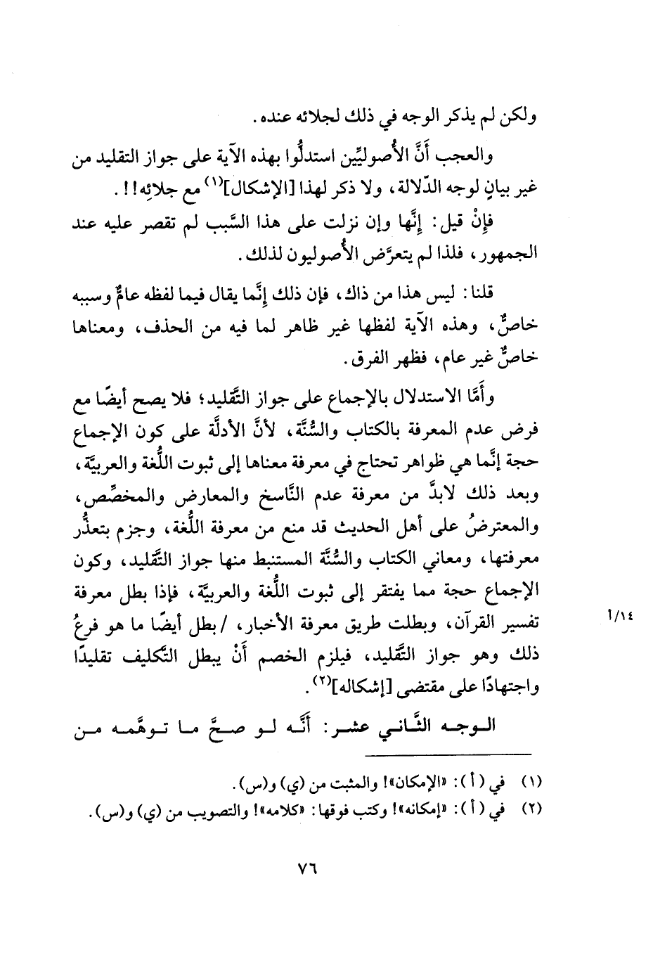 وأمّا الاستدلال بالإجماع على جواز التّقليد؛ فلا يصح أيضاً مع فرض عدم المعرفة بالكتاب والسّنّة, لأنّ الأدلّة على كون الإجماع حجة إنّما هي ظواهر تحتاج في معرفة معناها إلى ثبوت اللّغة والعربيّة, وبعد ذلك لابدّ من معرفة عدم النّاسخ والمعارض والمخصّص, والمعترض على أهل الحديث قد منع من معرفة اللّغة, وجزم بتعذّر معرفتها, ومعاني الكتاب والسّنة المستنبط منها جواز التّقليد, وكون الإجماع حجة مما يفتقر إلى ثبوت اللّغة والعربيّة, فإذا بطل معرفة تفسير القرآن, وبطلت طريق معرفة الأخبار, / بطل أيضاً ما هو فرع ذلك وهو جواز التّقليد, فيلزم الخصم أن يبطل التكليف تقليداً واجتهاداً على مقتضى [إشكاله] (¬2).