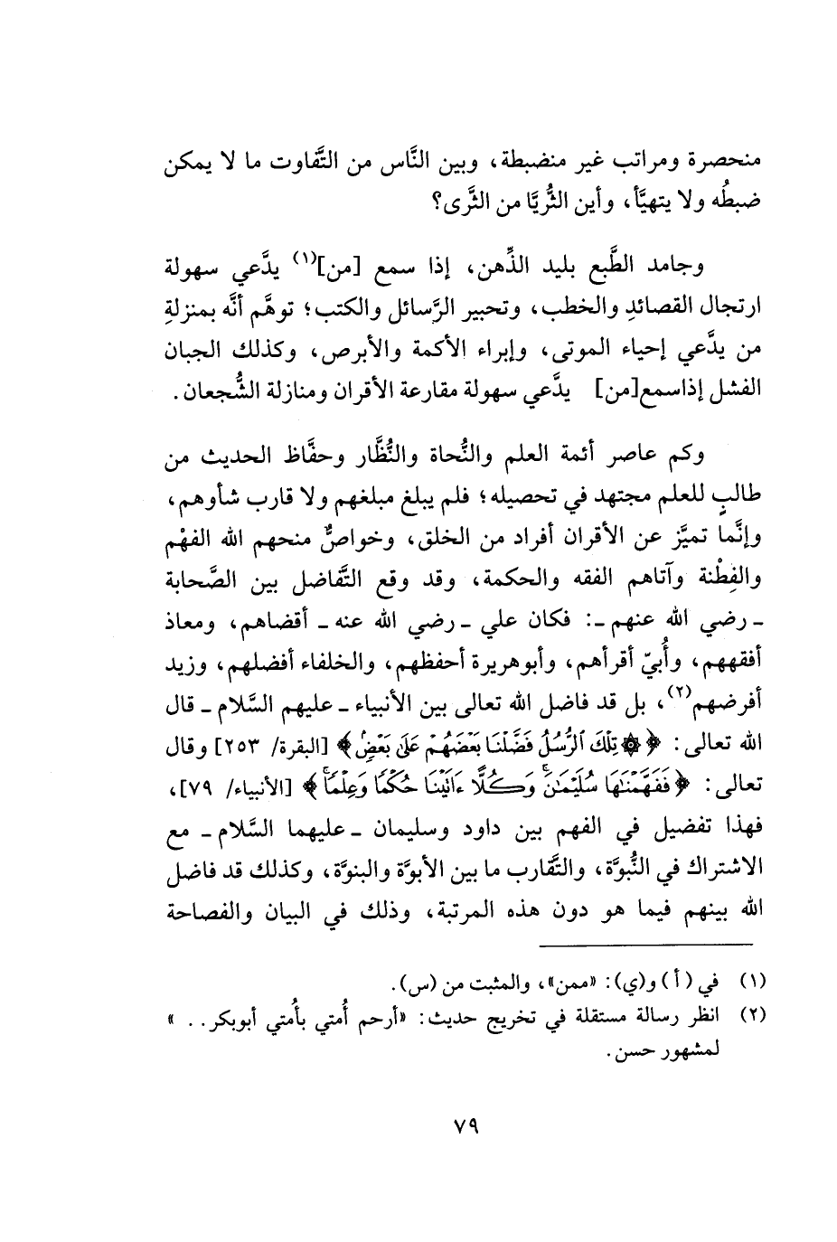 وكم عاصر أئمة العلم والنّحاة والنّظّار وحفّاظ الحديث من طالب للعلم مجتهد في تحصيله؛ فلم يبلغ مبلغهم ولا قارب شأوهم, وإنّما تميّز عن الأقران أفراد من الخلق, وخواصّ منحهم الله الفهم والفطنة وآتاهم الفقه والحكمة, وقد وقع التّفاضل بين الصّحابة -رضي الله عنهم-: فكان علي - رضي الله عنه - أقضاهم, ومعاذ أفقههم, وأبيّ أقرأهم, وأبو هريرة أحفظهم, والخلفاء أفضلهم, وزيد أفرضهم (¬2) , بل قد فاضل الله تعالى بين الأنبياء -عليهم السلام- قال الله تعالى: {تِلْكَ الرُّسُلُ فَضَّلْنَا بَعْضَهُم عَلَى بَعْضٍ} [البقرة:253] وقال تعالى: {فَفَهَّمْنَاهَا سُلَيْمَانَ وَكُلاًّ آتَيْنَا حُكْماً وَعِلْماً} [الأنبياء:79] , فهذا تفضيل في الفهم بين داود وسليمان - عليهما السلام- مع الاشتراك في النّبوّة, والتّقارب ما بين الأبوّة والبنوّة, وكذلك قد فاضل الله بينهم فيما هو دون هذه المرتبة, وذلك في البيان والفصاحة