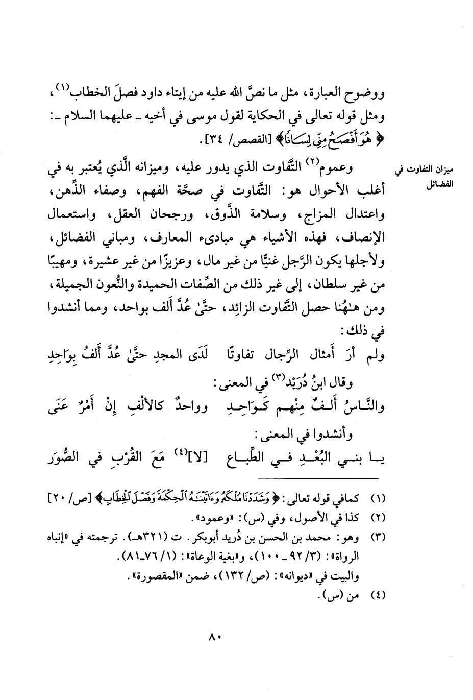 وعموم (¬2) التّفاوت الذي يدور عليه, وميزانه الذي يعتبر به في أغلب الأحوال هو: التّفاوت في صحّة الفهم, وصفاء الذّهن, واعتدال المزاج, وسلامة الذّوق, ورجحان العقل, واستعمال الإنصاف, فهذه الأشياء هي مبادىء المعارف, ومباني الفضائل, ولأجلها يكون الرّجل غنيّاً من غير مال, وعزيزاً من غير عشيرة, ومهيباً من غير سلطان, إلى غير ذلك من الصّفات الحميدة والنُّعون الجميلة, ومن ههنا حصل التّفاوت الزائد, حتّى عدّ ألف بواحد, ومما أنشدو في ذلك:
