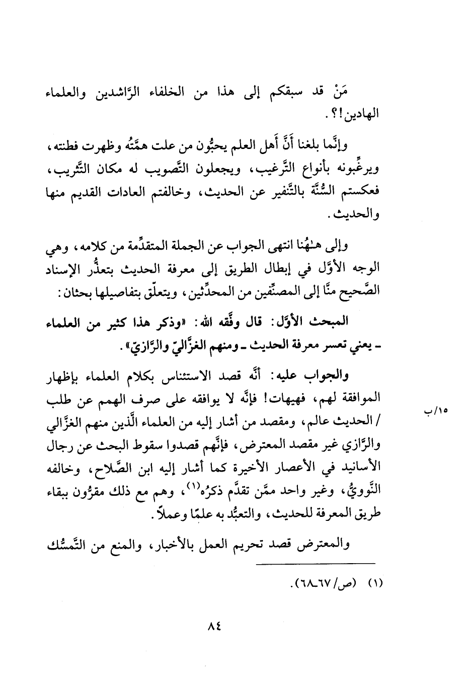 والجواب عليه: أنّه قصد الاستئناس بكلام العلماء بإظهار الموافقة لهم, فهيهات! فإنّه لا يوافقه على صرف الهمم عن طلب / الحديث عالم, ومقصد من أشار إليه من العلماء الذين منهم الغزالي والرّازي غير مقصد المعترض, فإنّهم قصدوا سقوط البحث عن رجال الأسانيد في الأعصار الأخيرة كما أشار إليه ابن الصّلاح, وخالفه النّووي, وغير واحد ممّن تقدّم ذكره (¬1) , وهم مع ذلك مقرّون ببقاء طريق المعرفة للحديث, والتعبّد به علماً وعملاً.