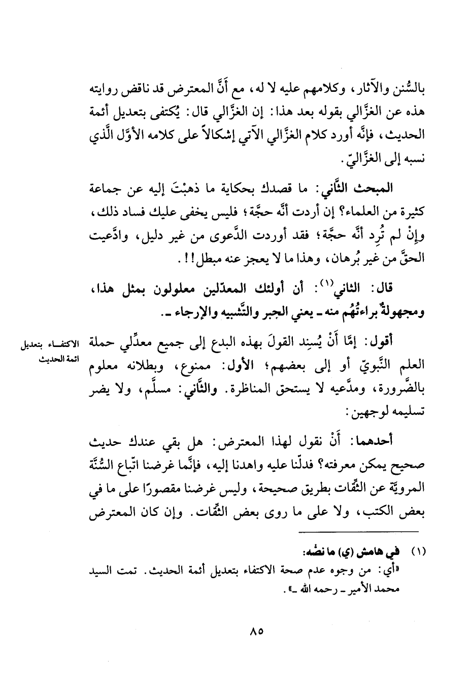 بالسّنن والآثار, وكلامهم عليه لا له, مع أنّ المعترض قد ناقض روايته هذه عن الغزالي بقوله بعد هذا: إنّ الغزالي قال: يُكتفى بتعديل أئمة الحديث, فإنّه أورد كلام الغزالي الآتي إشكالاً على كلامه الأول الذي نسبه إلى الغزالي.