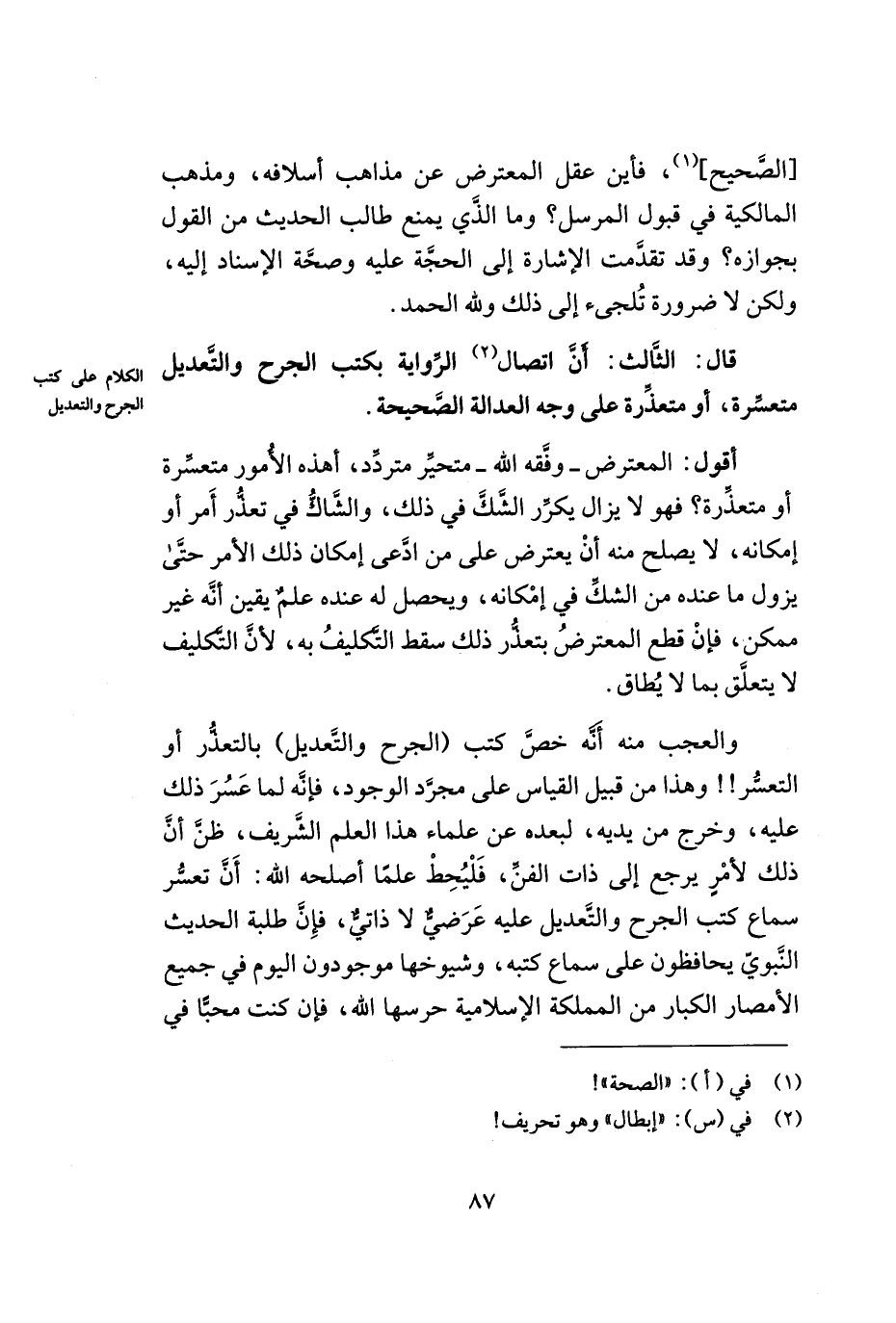 والعجب منه أنّه خصّ كتب (الجرح والتعديل) بالتعذّر أو التعسّر!! وهذا من قبيل القياس على مجرّد الوجود, فإنّه لما عسر ذلك عليه, وخرج من يديه, لبعده عن علماء هذا العلم الشّريف, ظنّ أنّ ذلك لأمر يرجع إلى ذات الفنّ, فليحط علماً أصلحه الله: أنّ تعسّر سماع كتب الجرح والتّعديل عليه عرضيّ لا ذاتيّ, فإنّ طلبة الحديث النّبوي يحافظون على سماع كتبه, وشيوخها موجودون اليوم في جميع الأمصار الكبار من المملكة الإسلامية حرسها الله, فإن كنت محبّاً في
