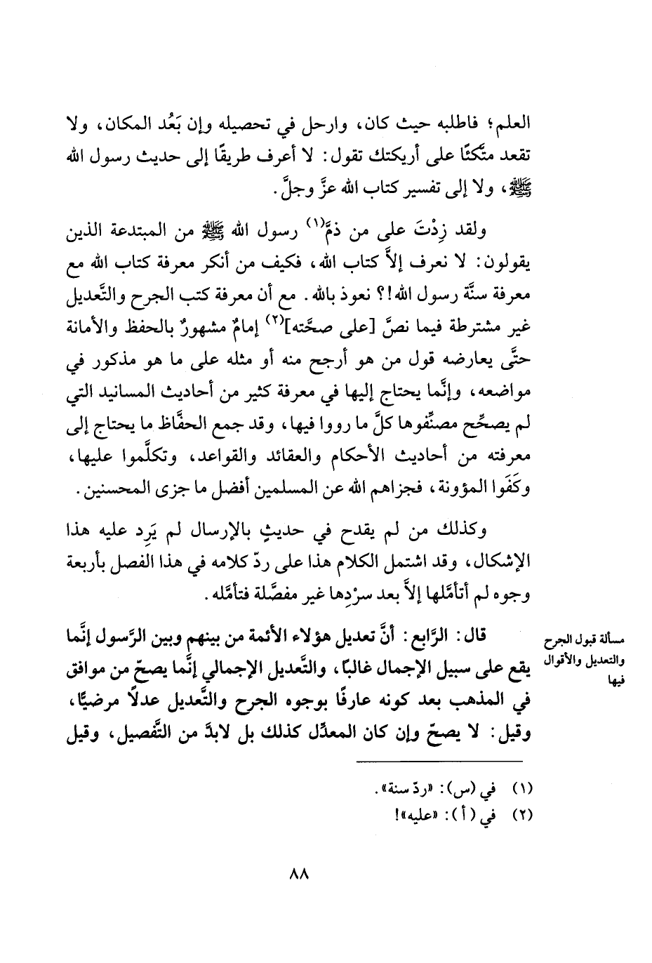 ولقد زدت على من ذمّ (¬1) رسول الله - صلى الله عليه وسلم - من المبتدعة الذين يقولون: لا نعرف إلا كتاب الله, فكيف من أنكر معرفة كتاب الله مع معرفة سنّة رسول الله!؟ نعوذ بالله. مع أن معرفة كتب الجرح والتّعديل غير مشترطة فيما نصّ [على صحّته] (¬2) إمام مشهور بالحفظ والأمانة حتّى يعارضه قول من هو أرجح منه أو مثله على ما هو مذكور في مواضعه, وإنّما يحتاج إليها في معرفة كثير من أحاديث المسانيد التي لم يصحّح مصنّفوها كلّ ما رووا فيها, وقد جمع الحفّاظ ما يحتاج إلى معرفته من أحاديث الأحكام والعقائد والقواعد, وتكلّموا عليها, وكفوا المؤونة, فجزاهم الله عن المسلمين أفضل ما جزى المحسنين.