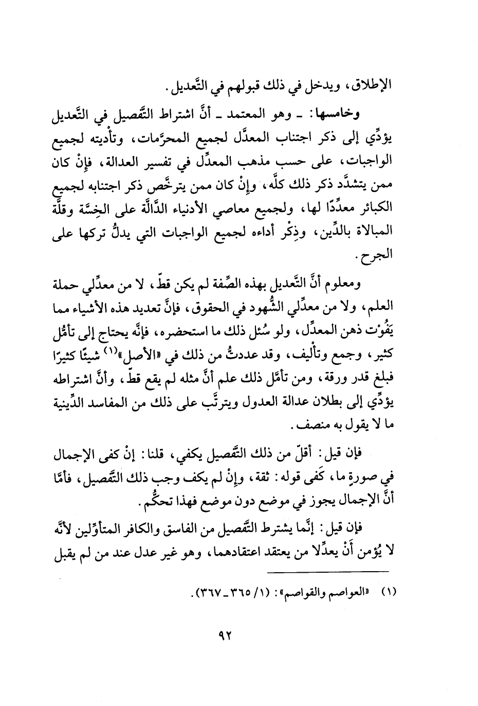 ومعلوم أنّ التّعديل بهذه الصّفة لم يكن قط, لا من معدّلي حملة العلم, ولا من معدّلي الشّهود في الحقوق, فإنّ تعديد هذه الأشياء مما يفوت ذهن المعدّل, ولو سئل ذلك ما استحضره, فإنّه يحتاج إلى تأمّل كثير, وجمع وتأليف, وقد عددتّ من ذلك في ((الأصل)) (¬1) شيئاً كثيراً فبلغ إلى بطلان عدالة العدول ويترتّب على ذلك من المفاسد الدّينية ما لا يقول به منصف.