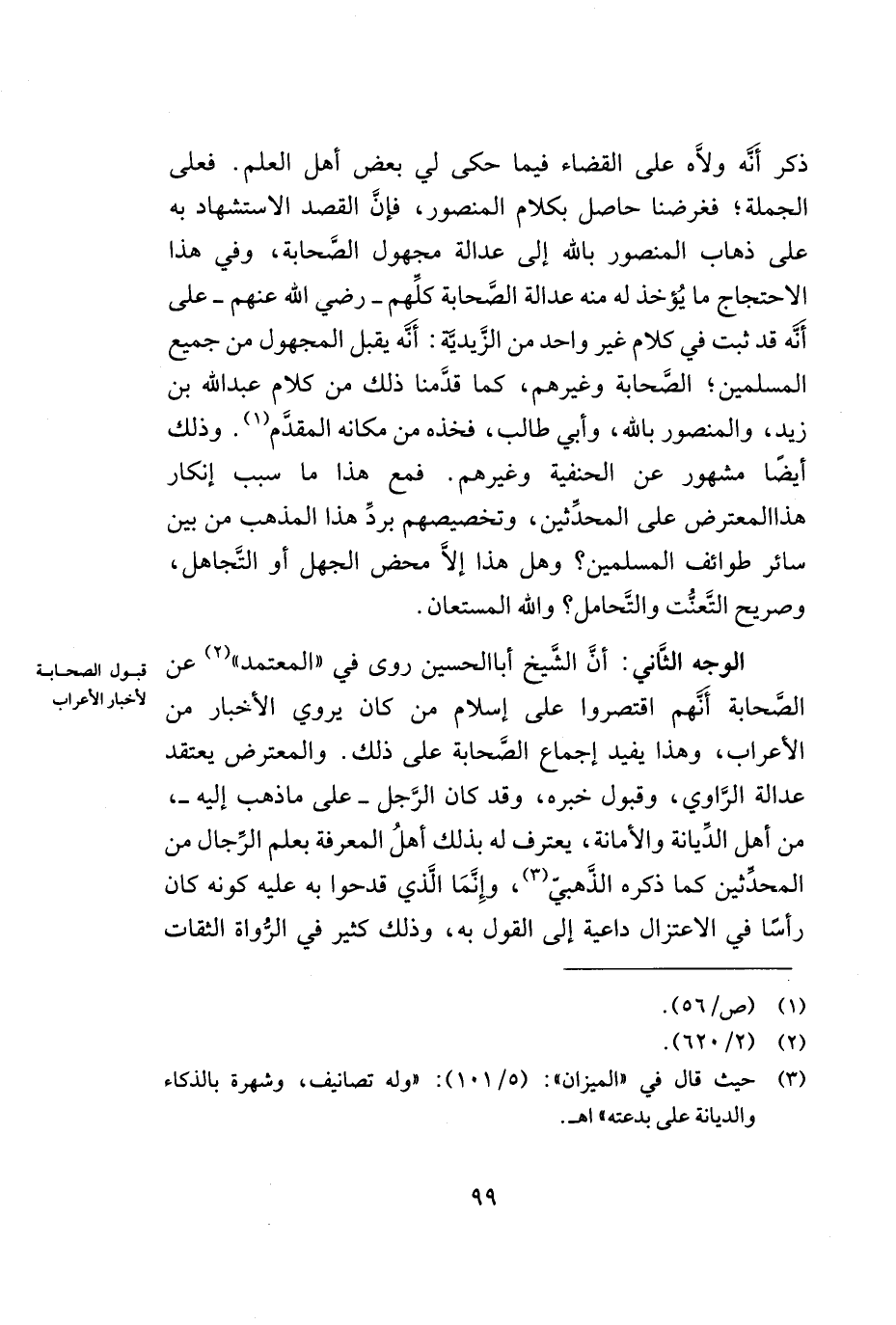 الوجه الثاني: أنّ الشّيخ أبا الحسن روى في ((المعتمد)) (¬2) عن الصّحابة أنّهم اقتصروا على إسلام من كان يروي الأخبار من الأعراب, وهذا يفيد إجماع الصّحابة على ذلك. والمعترض يعتقد عدالة الصّحابة, وقبول خبره, وقد كان الرّجل -على ما ذهب إليه, من أهل الدّيانة والأمانة, يعترف له بذلك أهل المعرفة بعلم الرّجال من المحدّثين كما ذكره الذّهبي (¬3) , وإنّما الذي قدحوا به عليه كونه كان رأساً في الاعتزال داعية إلى القول به, وذلك كثير في الرّواة الثقات