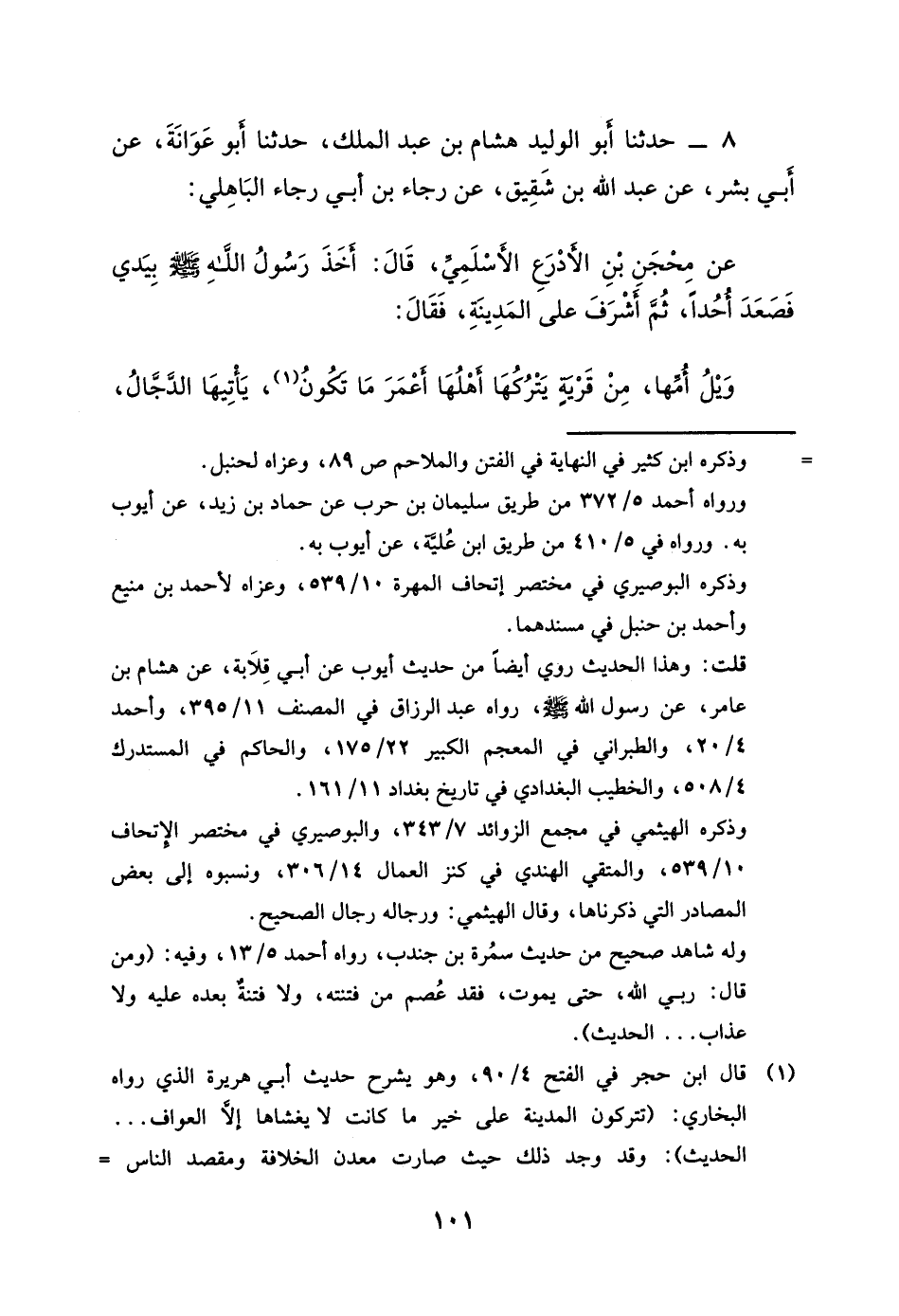 8 - حَدَّثَنَا أَبُو الْوَلِيدِ هِشَامُ بْنُ عَبْدِ الْمَلِكِ , حَدَّثَنَا أَبُو عَوَانَةَ، عَنْ أَبِي بِشْرٍ، عَنْ عَبْدِ اللَّهِ بْنِ شَقِيقٍ، عَنْ رَجَاءِ بْنِ أَبِي رَجَاءٍ الْبَاهِلِيِّ، عَنْ مِحْجَنِ بْنِ الْأَدْرَعِ الْأَسْلَمِيِّ، قَالَ: أَخَذَ رَسُولُ اللَّهِ صَلَّى اللهُ عَلَيْهِ وَسَلَّمَ بِيَدِي فَصَعِدَ أُحُدًا , ثُمَّ أَشْرَفَ عَلَى الْمَدِينَةِ فَقَالَ: «§وَيْلَ أُمِّهَا مِنْ قَرْيَةٍ يَتْرُكُهَا أَهْلُهَا أَعْمَرَ مَا تَكُونُ , يَأْتِيهَا الدَّجَّالُ , -[102]- فَيَجِدُ عَلَى كُلِّ بَابٍ مِنْ أَبْوَابِهَا مَلَكًا مُصْلِتًا فَلَا يَدْخُلُهَا» ثُمَّ انْحَدَرَ حَتَّى إِذَا كَانَ بِسُدَّةِ الْمَسْجِدِ إِذَا رَجُلٌ قَائِمٌ يُصَلِّي يَرْكَعُ وَيَسْجُدُ فَقَالَ: «مَنْ هَذَا؟» قُلْتُ: هَذَا فُلَانٌ هَذَا هَذَا , فَجَعَلْتُ أُطْرِيهِ , فَقَالَ: «اسْكُتْ لَا تُسْمِعْهُ فَتُهْلِكَهُ» ثُمَّ انْطَلَقَ يَمْشِي , فَلَمَّا دَنَا مِنْ حُجَرِ نِسَائِهِ نَزَعَ مِنْ يَدَيَّ، ثُمَّ قَالَ: «خَيْرُ دِينِكُمْ أَيْسَرُهُ»