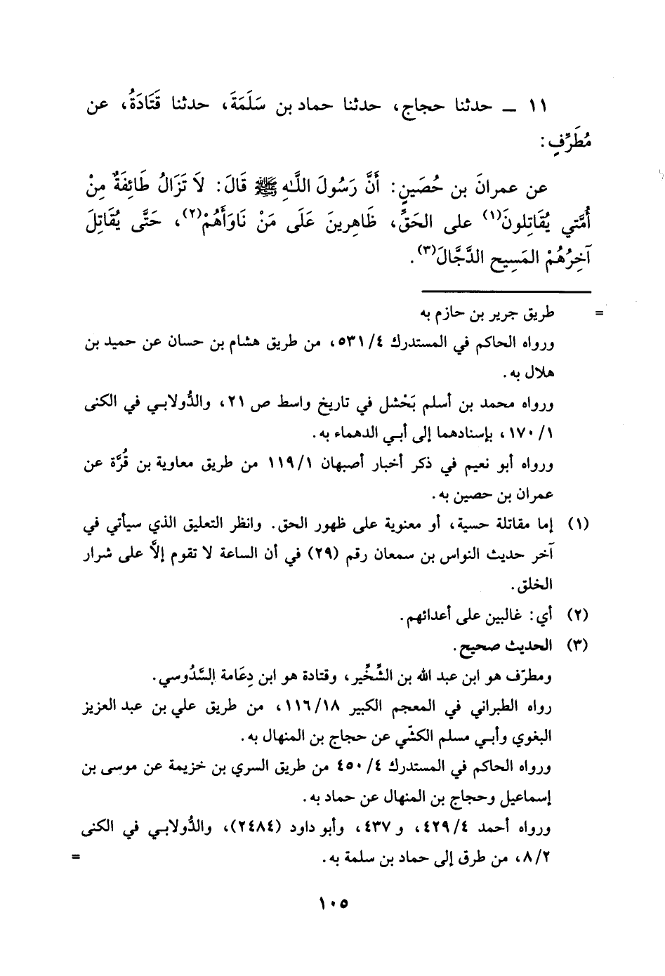 11 - حَدَّثَنَا حَجَّاجٌ، حَدَّثَنَا حَمَّادُ بْنُ سَلَمَةَ، حَدَّثَنَا قَتَادَةُ، عَنْ مُطَرِّفٍ، عَنْ عِمْرَانَ بْنِ حُصَيْنٍ، أَنَّ رَسُولَ اللَّهِ صَلَّى اللهُ عَلَيْهِ وَسَلَّمَ قَالَ: «§لَا تَزَالُ طَائِفَةٌ مِنْ أُمَّتِي يُقَاتِلُونَ عَلَى الْحَقِّ , ظَاهِرِينَ عَلَى مِنْ نَاوَأَهُمْ , حَتَّى يُقَاتِلَ آخِرُهُمُ الْمَسِيحَ الدَّجَّالَ»