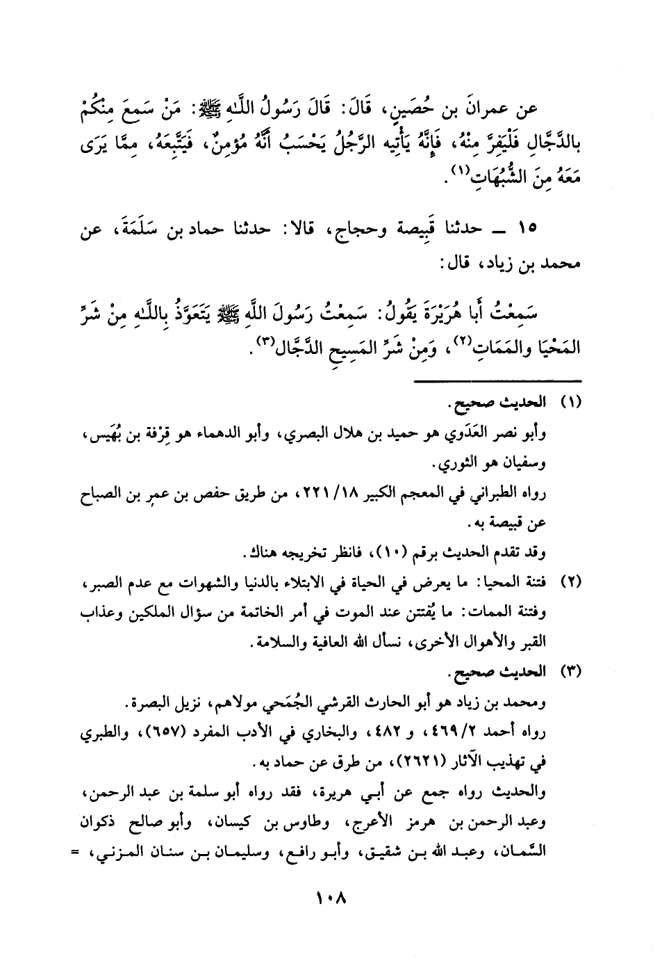 15 - حَدَّثَنَا قَبِيصَةُ، وَحَجَّاجٌ، قَالَا: حَدَّثَنَا حَمَّادُ بْنُ سَلَمَةَ، عَنْ مُحَمَّدِ بْنِ زِيَادٍ، قَالَ: سَمِعْتُ أَبَا هُرَيْرَةَ، يَقُولُ: سَمِعْتُ رَسُولَ اللَّهِ صَلَّى اللهُ عَلَيْهِ وَسَلَّمَ §يَتَعَوَّذُ بِاللَّهِ مِنْ شَرِّ الْمَحْيَا وَالْمَمَاتِ وَمِنْ شَرِّ الْمَسِيحِ الدَّجَّالِ