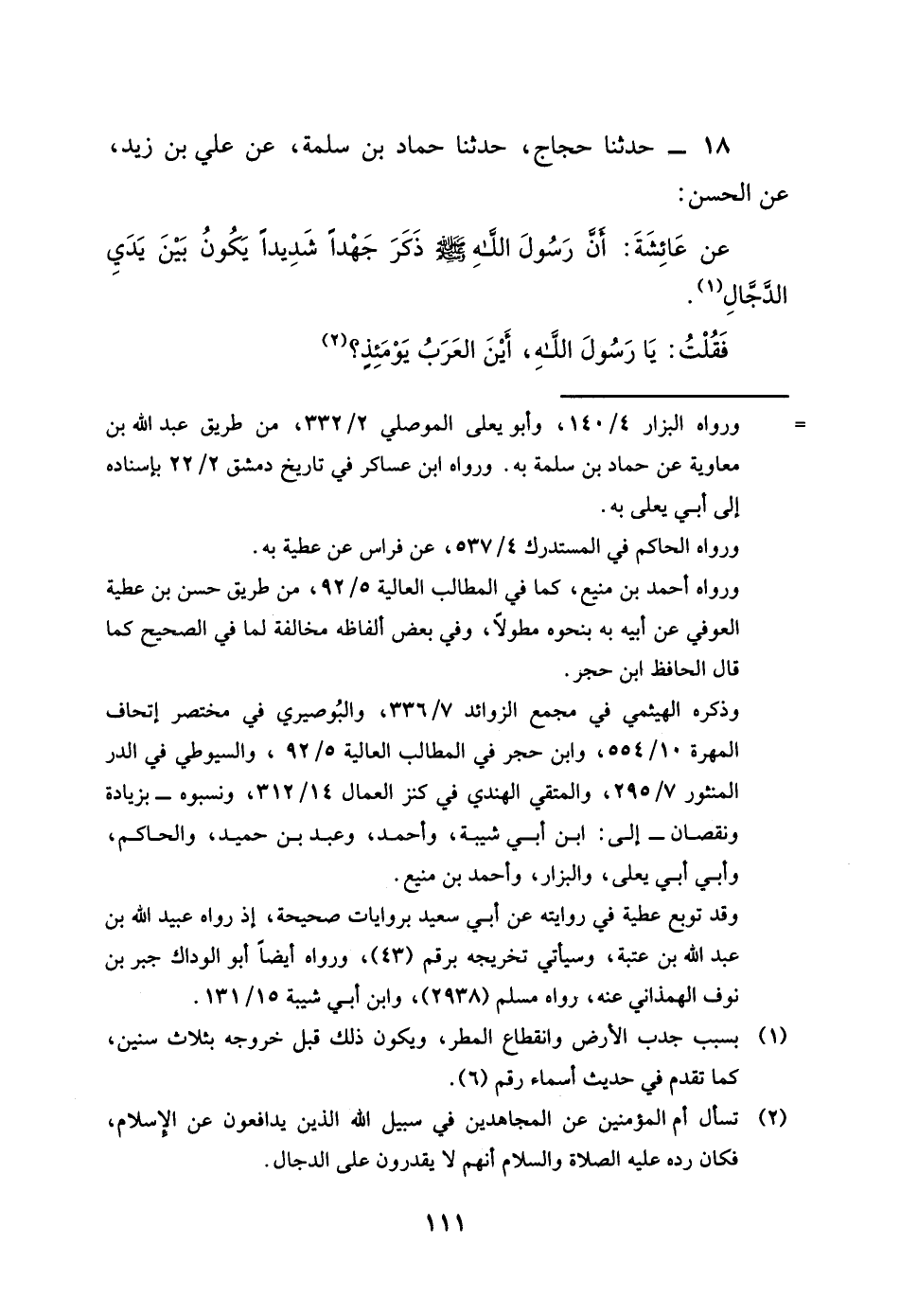 18 - حَدَّثَنَا حَجَّاجٌ، حَدَّثَنَا حَمَّادُ بْنُ سَلَمَةَ، عَنْ عَلِيِّ بْنِ زَيْدٍ، عَنِ الْحَسَنِ، عَنْ عَائِشَةَ، أَنَّ رَسُولَ اللَّهِ صَلَّى اللهُ عَلَيْهِ وَسَلَّمَ ذَكَرَ §جَهْدًا شَدِيدًا يَكُونُ بَيْنَ يَدَيِ الدَّجَّالِ فَقُلْتُ: يَا رَسُولَ اللَّهِ أَيْنَ الْعَرَبُ يَوْمَئِذٍ؟ -[112]- قَالَ: «يَا عَائِشَةُ إِنَّ الْعَرَبَ يَوْمَئِذٍ لَقَلِيلٌ» . قُلْتُ: يَا رَسُولَ اللَّهِ , فَمَا يُجْزِئُ الْمُؤْمِنَ يَوْمَئِذٍ؟ قَالَ: «التَّسْبِيحُ وَالتَّحْمِيدُ وَالتَّكْبِيرُ وَالتَّهْلِيلُ» . قُلْتُ: فَأَيُّ الْمَالِ يَوْمَئِذٍ خَيْرٌ؟ قَالَ: " غُلَامٌ شَدِيدٌ يَسْقِي أَهْلَهُ مِنَ الْمَاءِ , وَأَمَّا الطَّعَامُ فَلَا طَعَامَ