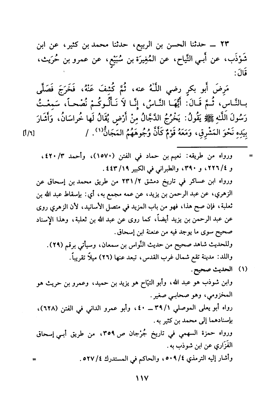 23 - حَدَّثَنَا الْحَسَنُ بْنُ رَبِيعٍ، حَدَّثَنَا مُحَمَّدُ بْنُ كَثِيرٍ، عَنِ ابْنِ شَوْذَبٍ، عَنْ أَبِي التَّيَّاحِ، عَنِ الْمُغِيرَةِ بْنِ سُبَيْعٍ، عَنْ عَمْرِو بْنِ حُرَيْثٍ، قَالَ: مَرِضَ أَبُو بَكْرٍ رَضِيَ اللَّهُ عَنْهُ , ثُمَّ كُشِفَ عَنْهُ , فَخَرَجَ فَصَلَّى بِالنَّاسِ , ثُمَّ قَالَ: أَيُّهَا النَّاسُ , إِنَّا لَا نَأْلُوكُمْ نُصْحًا , سَمِعْتُ رَسُولَ اللَّهِ صَلَّى اللهُ عَلَيْهِ وَسَلَّمَ يَقُولُ: " §يَخْرُجُ الدَّجَّالُ مِنْ أَرْضٍ يُقَالُ لَهَا: خُرَاسَانُ , وَأَشَارَ بِيَدِهِ نَحْوَ الْمَشْرِقِ , وَمَعَهُ قَوْمٌ كَأَنَّ وُجُوهَهُمُ الْمَجَانُّ "