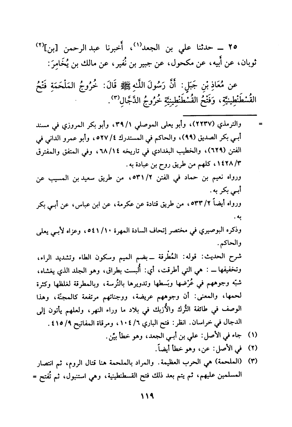 25 - حَدَّثَنَا عَلِيُّ بْنُ الْجَعْدِ، أَخْبَرَنَا عَبْدُ الرَّحْمَنِ بْنُ ثَوْبَانَ، عَنْ أَبِيهِ، عَنْ مَكْحُولٍ، عَنْ جُبَيْرِ بْنِ نُفَيْرٍ، عَنْ مَالِكِ بْنِ يُخَامِرَ، عَنْ مُعَاذِ بْنِ جَبَلٍ، أَنَّ رَسُولَ اللَّهِ صَلَّى اللهُ عَلَيْهِ وَسَلَّمَ قَالَ: «§خُرُوجُ الْمَلْحَمَةُ فَتْحُ الْقُسْطَنْطِينِيَّةِ , وَفَتْحُ الْقُسْطَنْطِينِيَّةِ خُرُوجُ الدَّجَّالِ» -[120]- ثُمَّ ضَرَبَ عَلَى فَخِذِ الَّذِي حَدَّثَهُ - يَعْنِي مُعَاذًا - أَوْ عَلَى مَنْكِبِهِ , فَقَالَ: «إِنَّ هَذَا الْحَقُّ كَمَا أَنَّكَ هَاهُنَا»