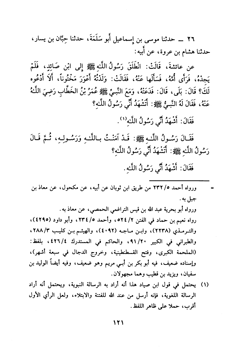 26 - حَدَّثَنَا مُوسَى بْنُ إِسْمَاعِيلَ أَبُو سَلَمَةَ، حَدَّثَنَا حَبَّانُ بْنُ يَسَارٍ، حَدَّثَنَا هِشَامُ بْنُ عُرْوَةَ، عَنْ أَبِيهِ، عَنْ عَائِشَةَ، قَالَتْ: §انْطَلَقَ رَسُولُ اللَّهِ صَلَّى اللهُ عَلَيْهِ وَسَلَّمَ إِلَى ابْنِ صَائِدٍ , فَلَمْ يَجِدْهُ , فَرَأَى أُمَّهُ فَسَأَلَهَا عَنْهُ فَقَالَتْ: وَلَدْتُهُ أَعْوَرَ مَخْتُونًا , أَلَا أَدْعُوهُ لَكَ؟ قَالَ: «بَلَى» قَالَ: فَدَعَتْهُ: وَمَعَ النَّبِيِّ صَلَّى اللهُ عَلَيْهِ وَسَلَّمَ عُمَرُ بْنُ الْخَطَّابِ رَضِيَ اللَّهُ عَنْهُ , فَقَالَ لَهُ النَّبِيُّ صَلَّى اللهُ عَلَيْهِ وَسَلَّمَ: " أَتَشْهَدُ أَنِّي رَسُولُ اللَّهِ؟ فَقَالَ: أَشْهَدُ أَنِّي رَسُولُ اللَّهِ. فَقَالَ رَسُولُ اللَّهِ صَلَّى اللهُ عَلَيْهِ وَسَلَّمَ: «قَدْ آمَنْتُ بِاللَّهِ وَرَسُولِهِ» ثُمَّ قَالَ رَسُولُ اللَّهِ صَلَّى اللهُ عَلَيْهِ وَسَلَّمَ: «أَتَشْهَدُ أَنِّي رَسُولُ اللَّهِ؟» . فَقَالَ: أَشْهَدُ أَنِّي رَسُولُ اللَّهِ -[122]-. فَقَالَ رَسُولُ اللَّهِ صَلَّى اللهُ عَلَيْهِ وَسَلَّمَ: " قَدْ آمَنْتُ بِاللَّهِ وَرَسُولِهِ، فَقَالَ النَّبِيُّ صَلَّى اللهُ عَلَيْهِ وَسَلَّمَ: «إِنِّي قَدْ خَبَّأْتُ لَكَ خَبِيئًا» . قَالَ: وَخَبَّأَ لَهُ الدُّخَانَ , فَقَالَ: ابْنُ صَائِدٍ: دُخٌّ دُخٌّ , فَقَالَ عُمَرُ: يَا رَسُولَ اللَّهِ , أَلَا أَضْرِبُ عُنُقَهُ؟ فَقَالَ: «لَا , إِنَّ يَكُنْ هُوَ فَسَيَكْفِيكَهُ اللَّهُ عَزَّ وَجَلَّ بِي»