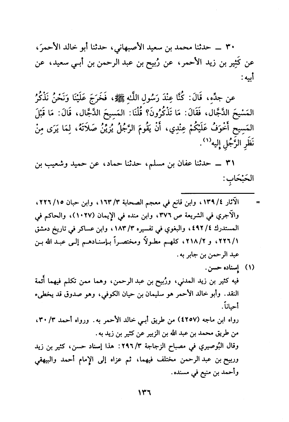30 - حَدَّثَنَا مُحَمَّدُ بْنُ سَعِيدٍ الْأَصْبَهَانِيُّ، حَدَّثَنَا أَبُو خَالِدٍ الْأَحْمَرُ، عَنْ كَثِيرِ بْنِ زَيْدٍ الْأَحْمَرِ، عَنْ رُبَيْحِ بْنِ عَبْدِ الرَّحْمَنِ بْنِ أَبِي سَعِيدٍ، عَنْ أَبِيهِ، عَنْ جَدِّهِ، قَالَ: كُنَّا عِنْدَ رَسُولِ اللَّهِ صَلَّى اللهُ عَلَيْهِ وَسَلَّمَ فَخَرَجَ عَلَيْنَا وَنَحْنُ نَذْكُرُ الْمَسِيحَ الدَّجَّالَ فَقَالَ: «مَا تَذْكُرُونَ؟» قُلْنَا: الْمَسِيحَ الدَّجَّالَ قَالَ: «مَا قَبْلَ الْمَسِيحِ §أَخْوَفُ عَلَيْكُمْ عِنْدِي , أَنْ يَقُومَ الرَّجُلُ يُزَيِّنُ صَلَاتَهُ لَمَّا يَرَى مِنْ نَظَرِ الرَّجُلِ إِلَيْهِ»