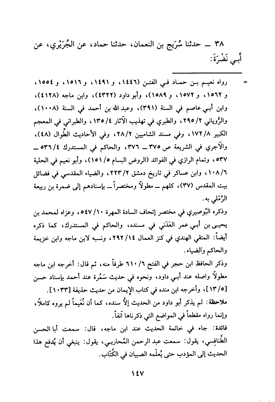 38 - حَدَّثَنَا سُرَيْجُ بْنُ النُّعْمَانِ، حَدَّثَنَا حَمَّادٌ، عَنِ الْجُرَيْرِيِّ -[148]-، عَنْ أَبِي النَّضْرَةَ، عَنْ أَبِي سَعِيدٍ، قَالَ: حَجَجْنَا فَنَزَلْنَا تَحْتَ شَجَرَةٍ , فَجَاءَ ابْنُ صَائِدٍ فَنَزَلَ فِي نَاحِيَتِهَا , فَقُلْتُ: إِنَّا لِلَّهِ مِنْ أَيْنَ سَلَّطْتَ عَلَيَّ هَذَا، فَقَالَ: يَا أَبَا سَعِيدٍ مَا أَلْقَى مِنَ النَّاسِ وَمَا يَقُولُونَ أَنِّي الدَّجَّالُ , أَمَا سَمِعْتَ رَسُولَ اللَّهِ صَلَّى اللهُ عَلَيْهِ وَسَلَّمَ يَقُولُ: «إِنَّ §الدَّجَّالَ لَا يُولَدُ لَهُ وَلَا يَدْخُلُ الْمَدِينَةَ وَلَا مَكَّةَ» قَالَ: قُلْتُ: بَلَى , قَالَ: فَقَدْ وُلِدَ لِي وَقَدْ خَرَجْتُ مِنَ الْمَدِينَةِ , وَأَنَا أُرِيدُ مَكَّةَ قَالَ أَبُو سَعِيدٍ: فَكَأَنِّي رَقَقْتُ لَهُ , فَقَالَ: وَاللَّهِ إِنَّ أَعْلَمَ النَّاسِ بِمَكَانِهِ أَنَا، فَقُلْتُ لَهُ: تَبًّا لَكَ سَائِرَ الْيَوْمِ