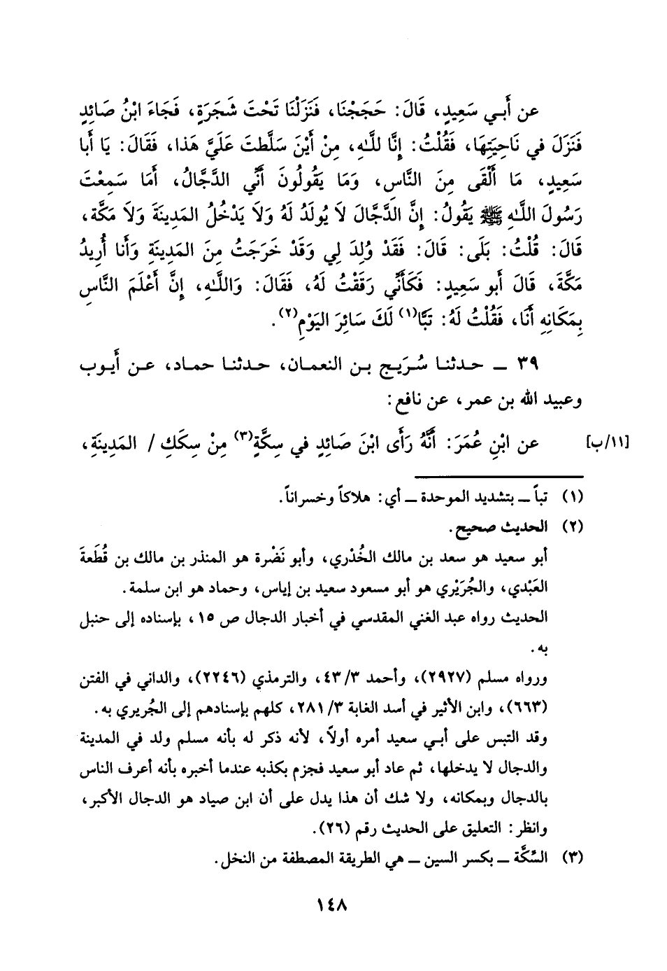 39 - حَدَّثَنَا سُرَيْجُ بْنُ النُّعْمَانِ، حَدَّثَنَا حَمَّادٌ، عَنْ أَيُّوبَ، وَعُبَيْدِ اللَّهِ بْنِ عُمَرَ، عَنْ نَافِعٍ، عَنِ ابْنِ عُمَرَ، أَنَّهُ رَأَى ابْنَ صَائِدٍ فِي سِكَّةٍ مِنْ سِكَكِ الْمَدِينَةِ -[149]- فَسَبَّهُ ابْنُ عُمَرَ وَوَقَعَ بِهِ , قَالَ: فَانْتَفَخَ حَتَّى سَدَّ الطَّرِيقَ فَضَرَبَهُ ابْنُ عُمَرَ بِعَصًا حَتَّى كَسَرَهَا عَلَيْهِ , فَقَالَتْ لَهُ حَفْصَةُ: مَا شَأْنُكَ وَشَأْنُهُ تُولَعُ بِهِ أَمَا سَمِعْتَ رَسُولَ اللَّهِ صَلَّى اللهُ عَلَيْهِ وَسَلَّمَ وَهُوَ يَقُولُ: «إِنَّمَا §يَخْرُجُ الدَّجَّالُ مِنْ غَضْبَةٍ يَغْضَبُهَا»