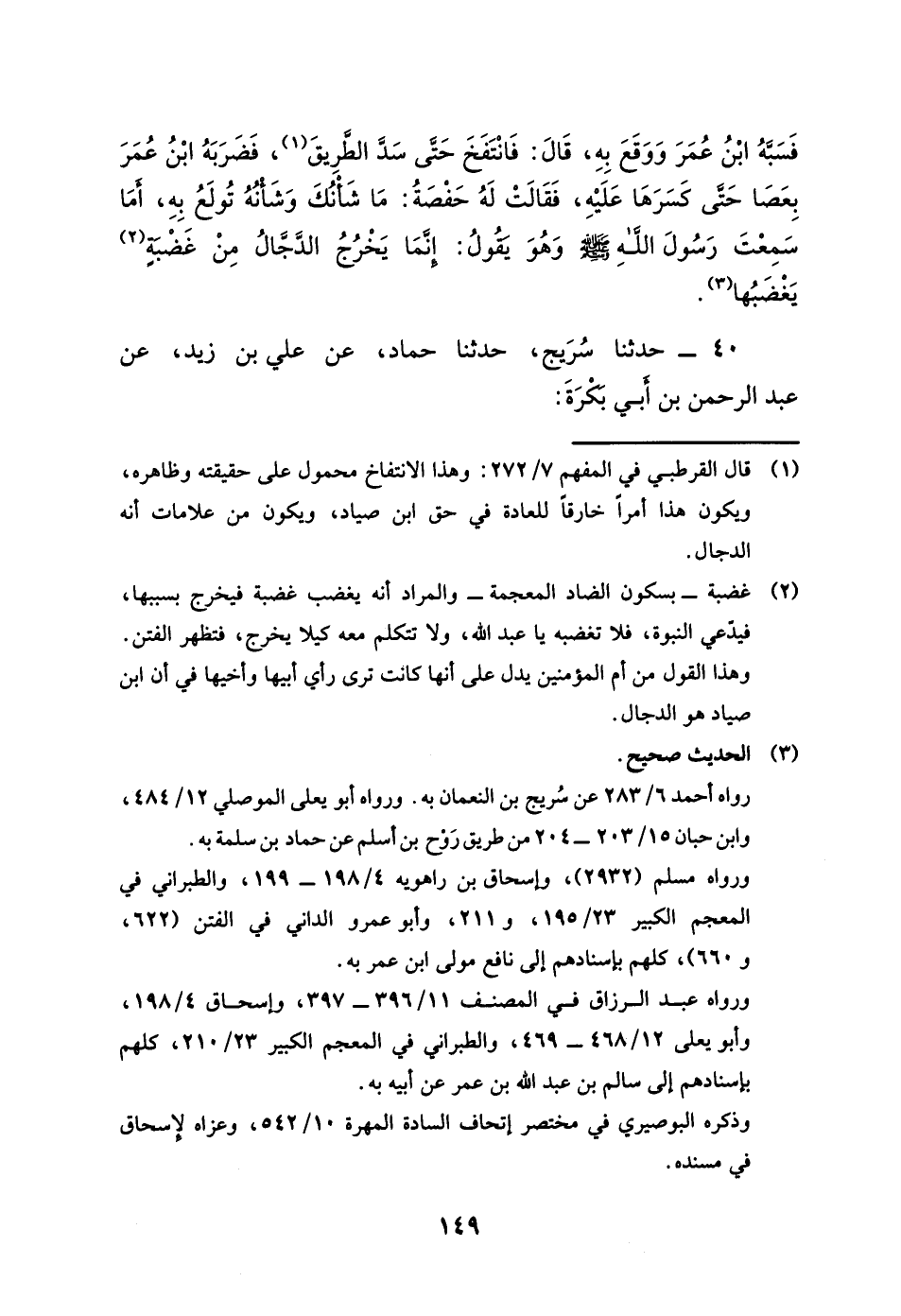40 - حَدَّثَنَا سُرَيْجٌ، حَدَّثَنَا حَمَّادٌ، عَنْ عَلِيِّ بْنِ زَيْدٍ، عَنْ عَبْدِ الرَّحْمَنِ بْنِ أَبِي بَكْرَةَ -[150]-، عَنْ أَبِيهِ، قَالَ: قَالَ رَسُولُ اللَّهِ صَلَّى اللهُ عَلَيْهِ وَسَلَّمَ: «§يَمْكُثُ أَبَوَا الدَّجَّالِ ثَلَاثِينَ عَامًا لَا يُولَدُ لَهُمَا , ثُمَّ يُولَدُ لَهُمَا غُلَامٌ أَعْوَرُ، أَضَرُّ شَيْءٍ , وَأَقَلُّهُ نَفْعًا , تَنَامُ عَيْنَاهُ وَلَا يَنَامُ قَلْبُهُ» ثُمَّ نَعَتَ رَسُولُ اللَّهِ صَلَّى اللهُ عَلَيْهِ وَسَلَّمَ أَبَوَيْهِ فَقَالَ: «أَبُوهُ رَجُلٌ طُوَالٌ، ضَرْبُ اللَّحْمُ، كَأَنَّ أَنْفَهُ مِنْقَارٌ , وَأُمُّهُ امْرَأَةٌ فِرْضَاحِيَّةٌ , طَوِيلَةُ الثَّدْيَيْنِ» قَالَ أَبُو بَكْرَةَ: فَسَمِعْنَا بِمَوْلُودٍ وُلِدَ فِي الْيَهُودِ فِي الْمَدِينَةِ قَالَ: فَذَهَبْتُ أَنَا وَالزُّبَيْرُ بْنُ الْعَوَّامِ حَتَّى دَخَلْنَا عَلَى أَبَوَيْهِ , فَإِذَا نَعْتُ رَسُولِ اللَّهِ صَلَّى اللهُ عَلَيْهِ وَسَلَّمَ فِيهِمَا , فَقُلْنَا: هَلْ لَكُمَا وَلَدٌ؟ فَقَالَا مَكَثْنَا ثَلَاثِينَ سَنَةً لَا يُولَدُ لَنَا , ثُمَّ وُلِدَ لَنَا غُلَامٌ أَعْوَرُ أَضَرُّ شَيْءٍ وَأَقَلُّهُ نَفْعًا، تَنَامُ عَيْنَاهُ وَلَا يَنَامُ قَلْبُهُ -[151]-، فَخَرَجْنَا مِنْ عِنْدِهِمَا , فَإِذَا بِهِ مُنْجَدِلٌ فِي قَطِيفَةٍ فِي الشَّمْسِ , لَهُ هَمْهَمَةٌ , قَالَ: فَكَشَفَ عَنْ رَأْسِهِ فَقَالَ: مَا قُلْتُمَا؟ قَالَ: قُلْنَا: هَلْ سَمِعْتَ مَا قُلْنَا؟ قَالَ: نَعَمْ , إِنَّهُ تَنَامُ عَيْنَايَ وَلَا يَنَامُ قَلْبِي