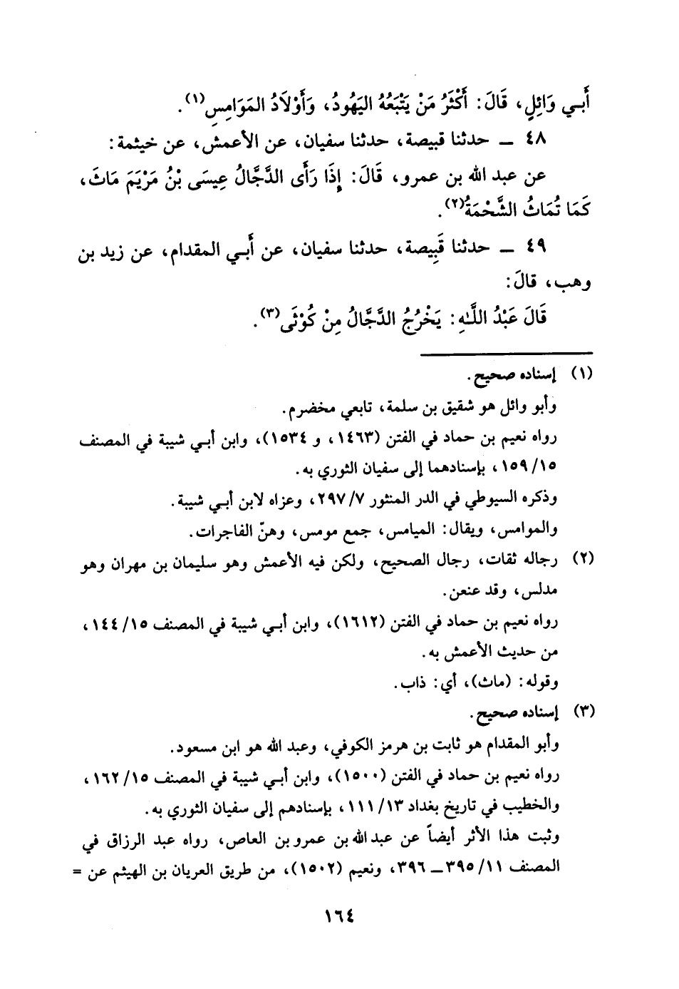 48 - حَدَّثَنَا قَبِيصَةُ، حَدَّثَنَا سُفْيَانُ، عَنِ الْأَعْمَشِ، عَنْ خَيْثَمَةَ، عَنْ عَبْدِ اللَّهِ بْنِ عَمْرٍو، قَالَ: §إِذَا رَأَى الدَّجَّالُ عِيسَى ابْنَ مَرْيَمَ مَاثَ كَمَا تُمَاثُ الشَّحْمَةُ