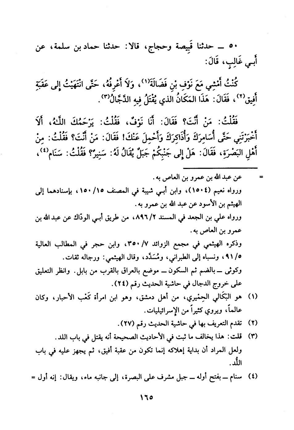 50 - حَدَّثَنَا قَبِيصَةُ، وَحَجَّاجٌ، قَالَا: حَدَّثَنَا حَمَّادُ بْنُ سَلَمَةَ، عَنْ أَبِي غَالِبٍ، قَالَ: كُنْتُ أَمْشِي مَعَ نَوْفِ بْنِ فَضَالَةَ , وَلَا أَعْرِفُهُ , حَتَّى انْتَهَيْتُ إِلَى عَقَبَةِ أَفِيقَ , فَقَالَ: هَذَا الْمَكَانُ الَّذِي يُقْتَلُ فِيهِ الدَّجَّالُ فَقُلْتُ: مَنْ أَنْتَ؟ فَقَالَ: أَنَا نَوْفٌ , فَقُلْتُ: يَرْحَمُكُ اللَّهُ أَلَا أَخْبَرْتَنِي حَتَّى أُسَامِرَكَ وَأُذَاكِرَكَ وَأَحْمِلَ عَنْكَ؟ فَقَالَ: مَنْ أَنْتَ؟ فَقُلْتُ: مِنْ أَهْلِ الْبَصْرَةِ , فَقَالَ: هَلْ إِلَى جَنْبِكُمْ جَبَلٌ يُقَالُ لَهُ: سَنِيرٌ؟ فَقُلْتُ: سَنَامٌ , -[166]- فَقَالَ: هُوَ هُوَ , فَقَالَ: هَلْ إِلَى جَنْبِكُمْ نَهْرٌ يُقَالُ لَهُ: الصَّفِيُّ؟ فَقُلْتُ: صَفْوَانُ , فَقَالَ هُوَ هُوَ , أَمَا إِنَّهُمَا يُسَيَّرَانِ مَعَ الدَّجَّالِ طَعَامًا وَشَرَابًا , وَهُوَ جَبَلٌ مَلْعُونٌ , وَهُوَ أَوَّلُ جَبَلٍ وُضِعَ فِي الْأَرْضِ. §ثُمَّ يَنْزِلُ عِيسَى عَلَيْهِ السَّلَامُ فَيَمْكُثُ فِي الْأَرْضِ أَرْبَعِينَ صَبَاحًا , الْيَوْمُ كَالسَّاعَةِ , وَالشَّهْرُ كَالْجُمُعَةِ , وَالْجُمُعَةُ كَالْيَوْمِ