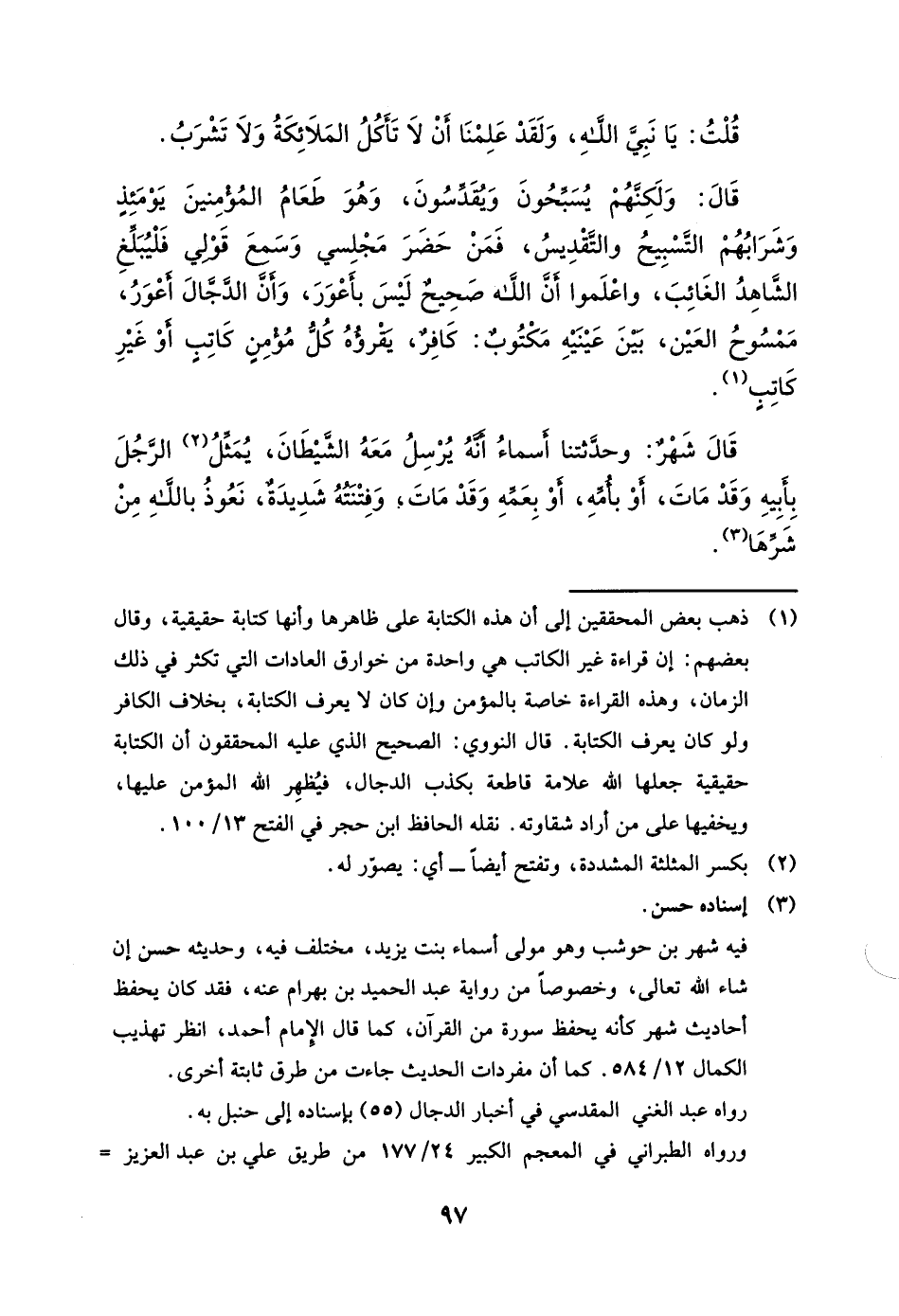 قَالَ شَهْرٌ: وَحَدَّثَتْنَا أَسْمَاءُ أَنَّهُ يُرْسَلُ مَعَهُ الشَّيْطَانُ يُمَثَّلُ الرَّجُلَ بِأَبِيهِ وَقَدْ مَاتَ , أَوْ بِأُمِّهِ , أَوْ بِعَمِّهِ وَقَدْ مَاتَ , §وَفِتْنَتُهُ شَدِيدَةٌ نَعُوذُ بِاللَّهِ مِنْ شَرِّهَا