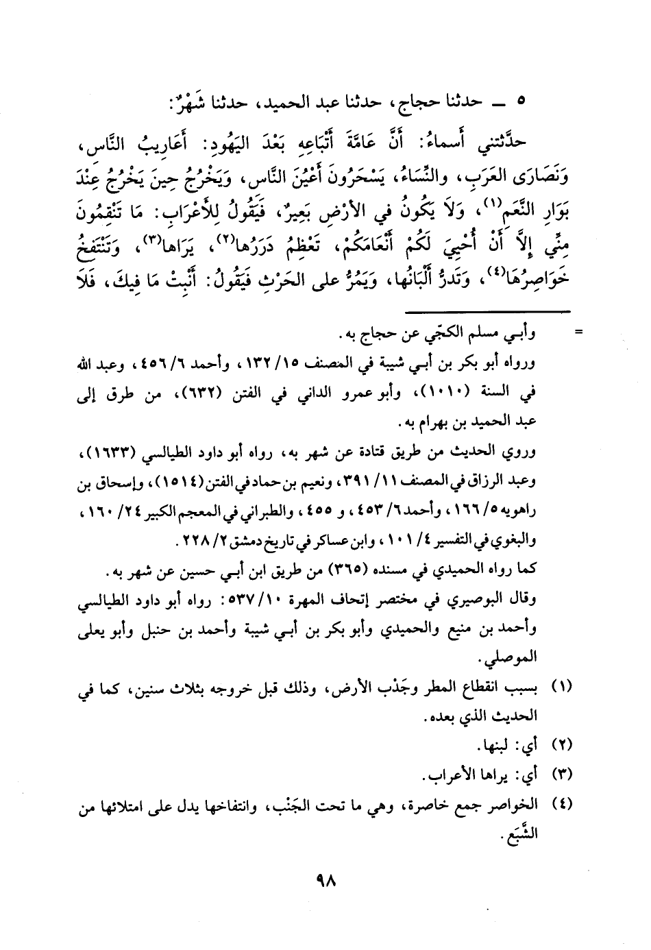5 - حَدَّثَنَا حَجَّاجٌ، حَدَّثَنَا عَبْدُ الْحَمِيدِ، حَدَّثَنَا شَهْرٌ، حَدَّثَتْنِي أَسْمَاءُ، أَنَّ §عَامَّةَ أَتْبَاعِهِ بَعْدَ الْيَهُودِ أَعَارِيبُ النَّاسِ , وَنَصَارَى الْعَرَبِ وَالنِّسَاءُ , يَسْحَرُونَ أَعْيُنَ النَّاسِ , وَيَخْرُجُ حِينَ يَخْرُجُ عِنْدَ بَوَارِ النَّعَمِ , وَلَا يَكُونُ فِي الْأَرْضِ بَعِيرٌ، فَيَقُولُ لِلْأَعْرَابِ: مَا تَنْقِمُونَ مِنِّي إِلَّا أَنْ أُحْيِيَ لَكُمْ أَنْعَامَكُمْ , تَعْظُمُ دَرَرُهَا , يَرَاهَا وَتَنْتَفِخُ خَوَاصِرُهَا , وَتَدُرُّ أَلْبَانُهَا , وَيَمُرُّ عَلَى الْحَرْثِ فَيَقُولُ: أَنْبِتْ مَا فِيكَ , فَلَا -[99]- يَدَعْ فِي بَطْنِهَا شَيْئًا إِلَّا أَخْرَجَتْهُ