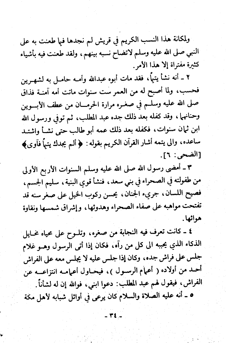 3 - أمضى رسول الله صلى الله عليه وسلم السنوات الأربع الأولى من طفولته في الصحراء في بني سعد، فنشأ قوي البنية، سليم الجسم، فصيح اللسان، جريء الجنان، يحسن ركوب الخيل على صغر سنه قد تفتحت مواهبه على صفاء الصحراء وهدوئها، وإشراق شمسها ونقاوة هوائها.