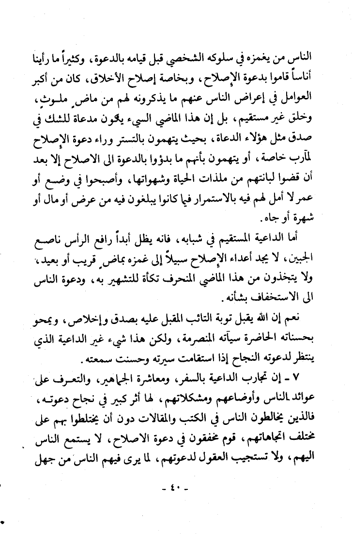 7 - إن تجارب الداعية بالسفر، ومعاشرة الجماهير، والتعرف على عوائد الناس وأوضاعهم ومشكلاتهم، لها أثر كبير في نجاح دعوته، فالذين يخالطون الناس في الكتب والمقالات دون أن يختلطوا بهم على مختلف اتجاهاتهم، قوم مخفقون في دعوة الإصلاح، لا يستمع الناس إليهم، ولا تستجيب العقول لدعوتهم، لما يرى فيهم الناس من جهل