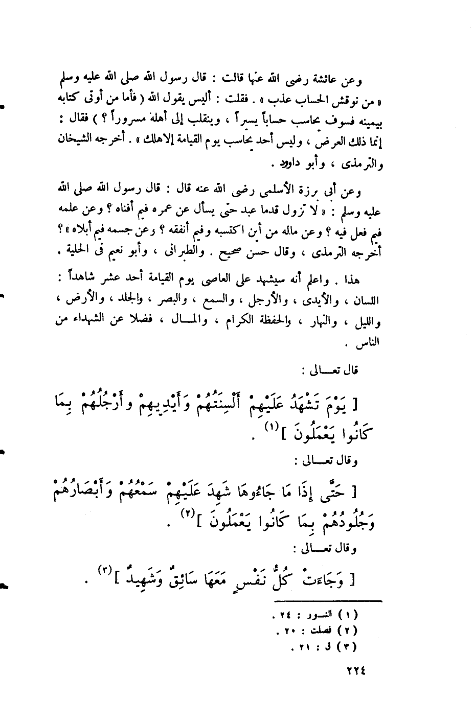 وعن عائشة رضي الله عنها قالت: قال رسول الله صلى الله عليه وسلم "من نوقش الحساب عذب". فقلت: أليس يقول الله {فأما من أوتي كتابه بيمينه فسوف يحاسب حساباً يسيراً، وينقلب إلى أهله مسروراً} فقالت: إنما ذلك العرض، وليس أحد يحاسب يوم القيامة إلا هلك". أخرجه الشيخان والترمذي، وأبو داوود.