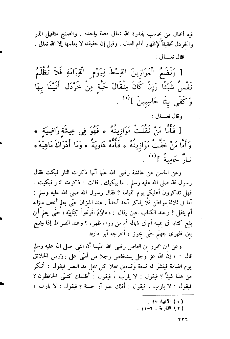 فيه أعمال من يحاسب بقدرة الله تعالى دفعة واحدة. والصنج مثاقيل الذر والخردل تحقيقاً لإظهار تمام العدل. وقيل إن حقيقته لا يعلمها إلا الله تعالى.