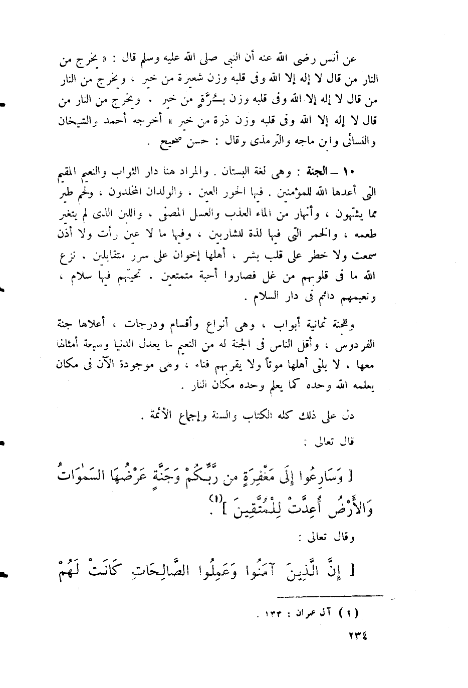 عن أنس رضي الله عنه أن النبي صلى الله عليه وسلم قال: "يخرج من النار من قال لا إله إلا الله وفي قلبه وزن شعيرة من خير، ويخرج من النار من قال لا إله إلا الله وفي قلبه وزن بُرّة من خير، ويخرج من النار من قال لا إله إلا الله وفي قلبه وزن ذرة من خير". أخرجه أحمد والشيخان والنسائي وابن ماجه والترمذي وقال: حسن صحيح.