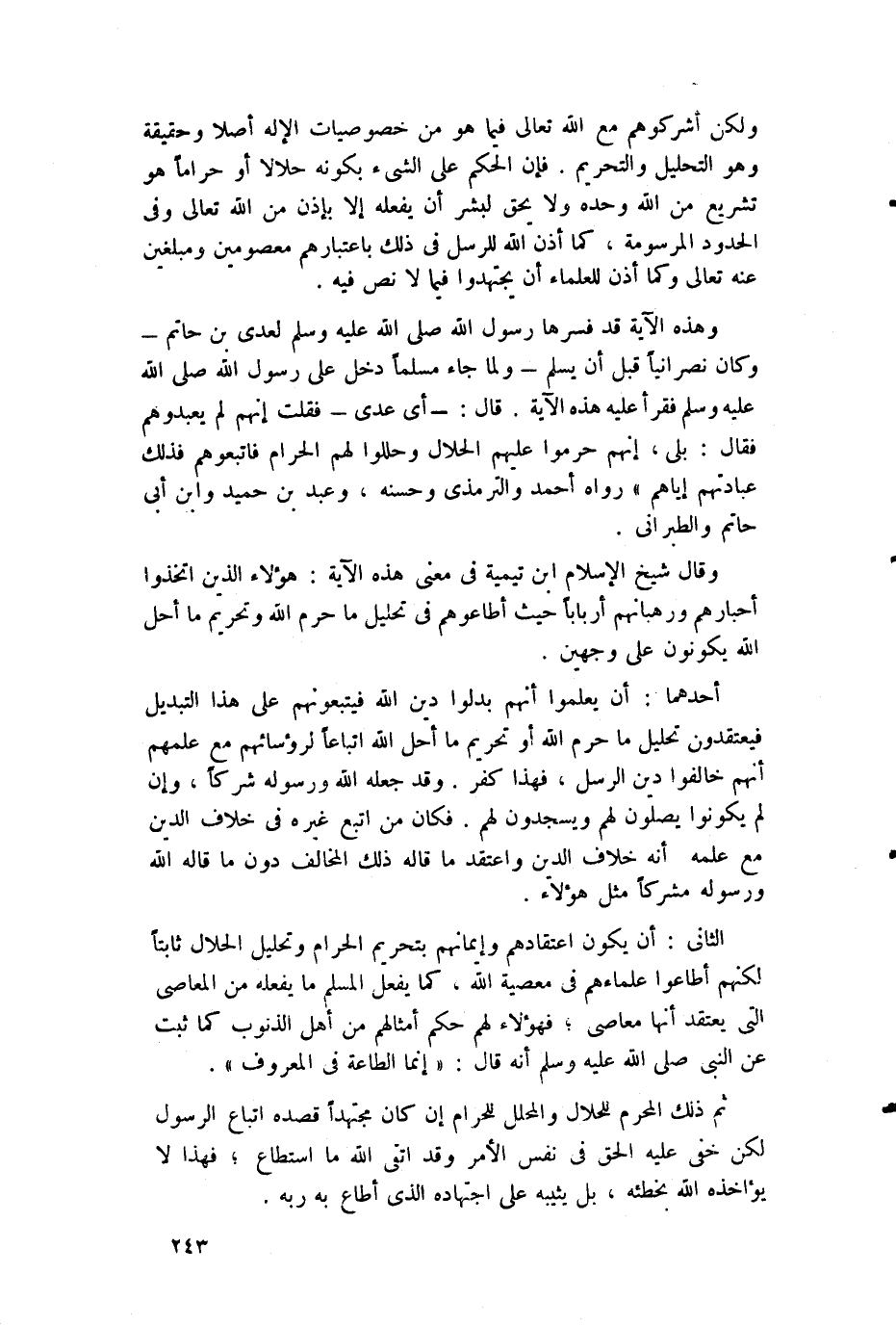 وقال شيخ الإسلام ابن تيمية في معنى هذه الآية: هؤلاء الذين اتخذوا أحبارهم ورهبانهم أرباباً حيث أطاعوهم في تحليل ما حرم الله وتحريم ما أحل الله يكونون على وجهين.