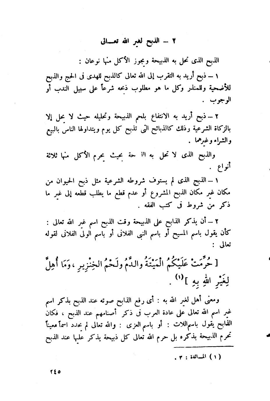 2 - أن يذكر الذابح على الذبيحة وقت الذبح اسم غير الله تعالى كأن يقول: باسم المسيح أو باسم النبي الفلاني أو باسم الولي الفلاني لقوله تعالى: