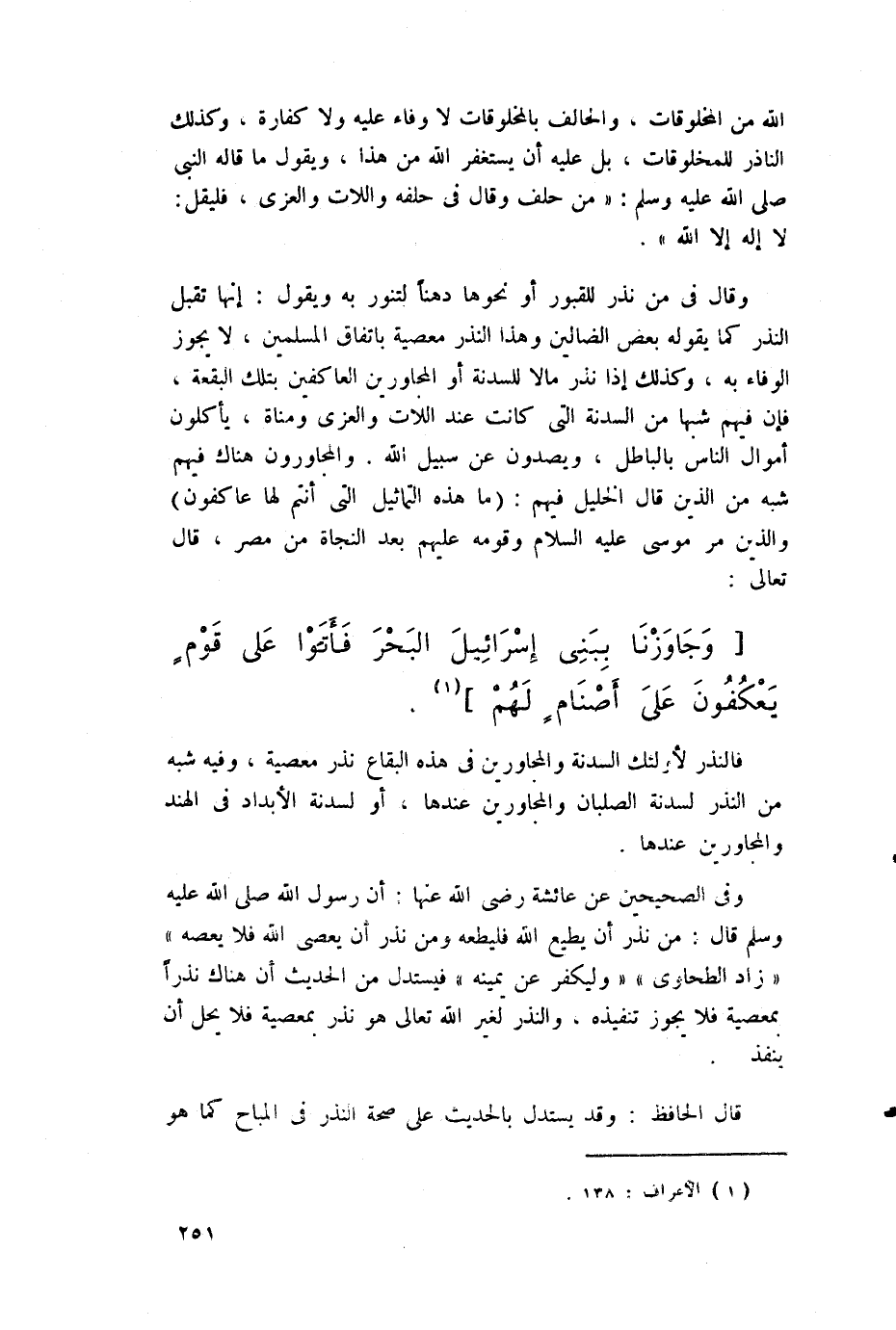 وقال في من نذر للقبور أو نحوها دهناً لتنور به ويقول: إنها تقبل النذر كما يقوله بعض الضالين، وهذا النذر معصية باتفاق المسلمين، لا يجوز الوفاء به، وكذلك إذا نذر مالاً لسدنة أو المجاورين العاكفين بتلك البقعة، فإن فيهم شبهاً من السدنة التي كانت عند اللات والعزى ومناة، يأكلون أموال الناس بالباطل، ويصدون عن سبيل الله. والمجاورون هناك فيهم شبه من الذين قال الخليل فيهم: {ما هذه التماثيل التي أنتم لها عاكفون} والذين مر موسى عليه السلام وقومه عليهم بعد النجاة من مصر، قال تعالى: