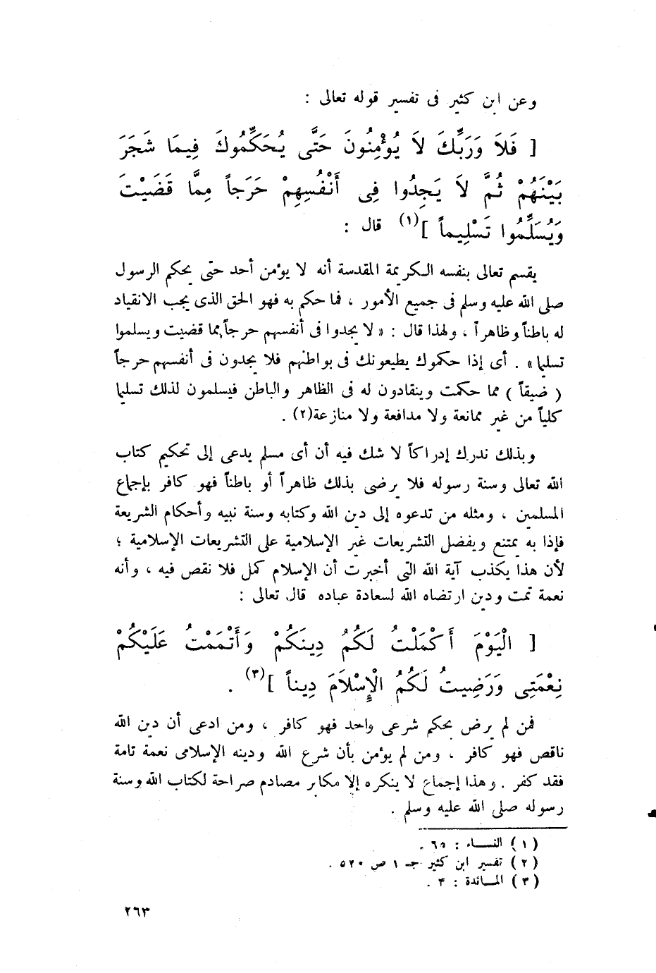 وبذلك ندرك إدراكاً لا شك فيه أن أي مسلم يدعى إلى تحكيم كتاب الله تعالى وسنة رسوله فلا يرضى بذلك ظاهراً أو باطناً فهو كافر بإجماع المسلمين، ومثله من تدعوه إلى دين الله وكتابه وسنة نبيه وأحكام الشريعة فإذا به يمتنع ويفضل التشريعات غير الإسلامية على التشريعات الإسلامية، لأن هذا يكذب آية الله التي أخبرت أن الإسلام كمل فلا نقص فيه، وأنه نعمة تمت ودين ارتضاه الله لسعادة عباده قال تعالى: